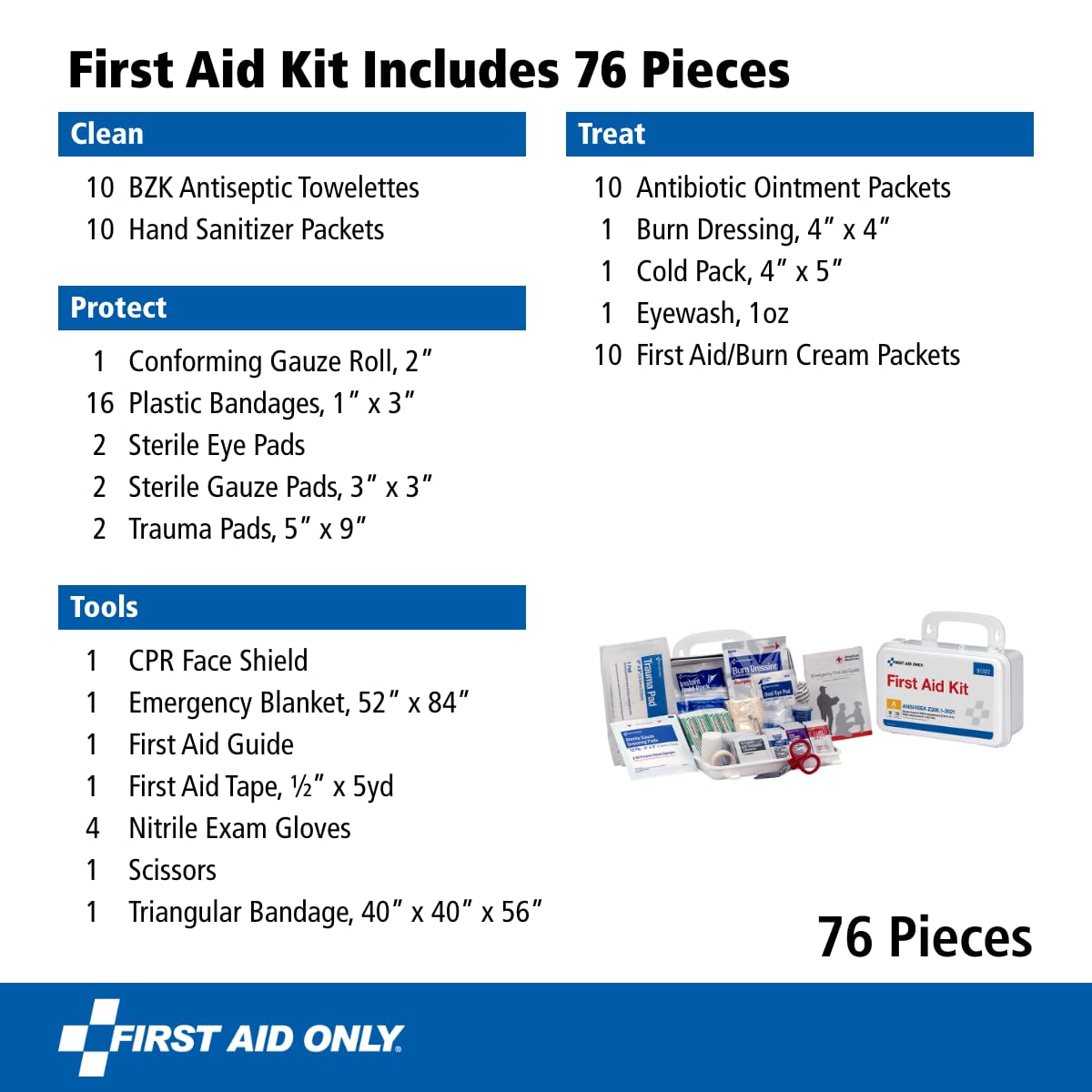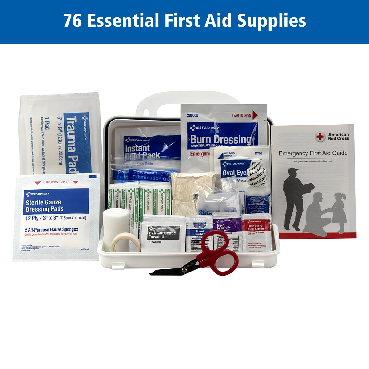 ANSI 2021 A and OSHA Compliant Emergency Kit: Includes adhesive plastic bandages, antibiotic ointments, BZK antiseptic towelettes, burn cream packets, gauze roll and pads, gloves, scissors, and other multi-use first aid items, including eye wash and an emergency blanket