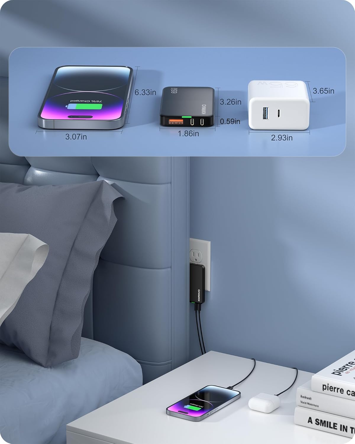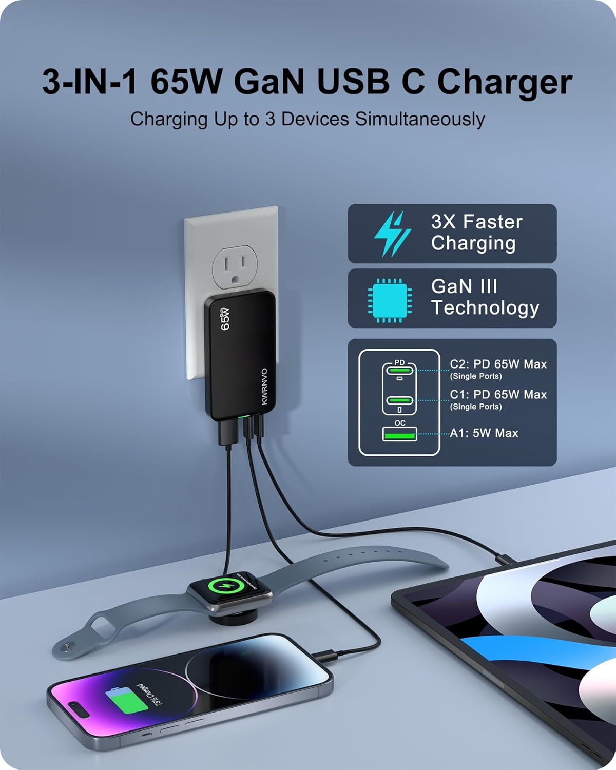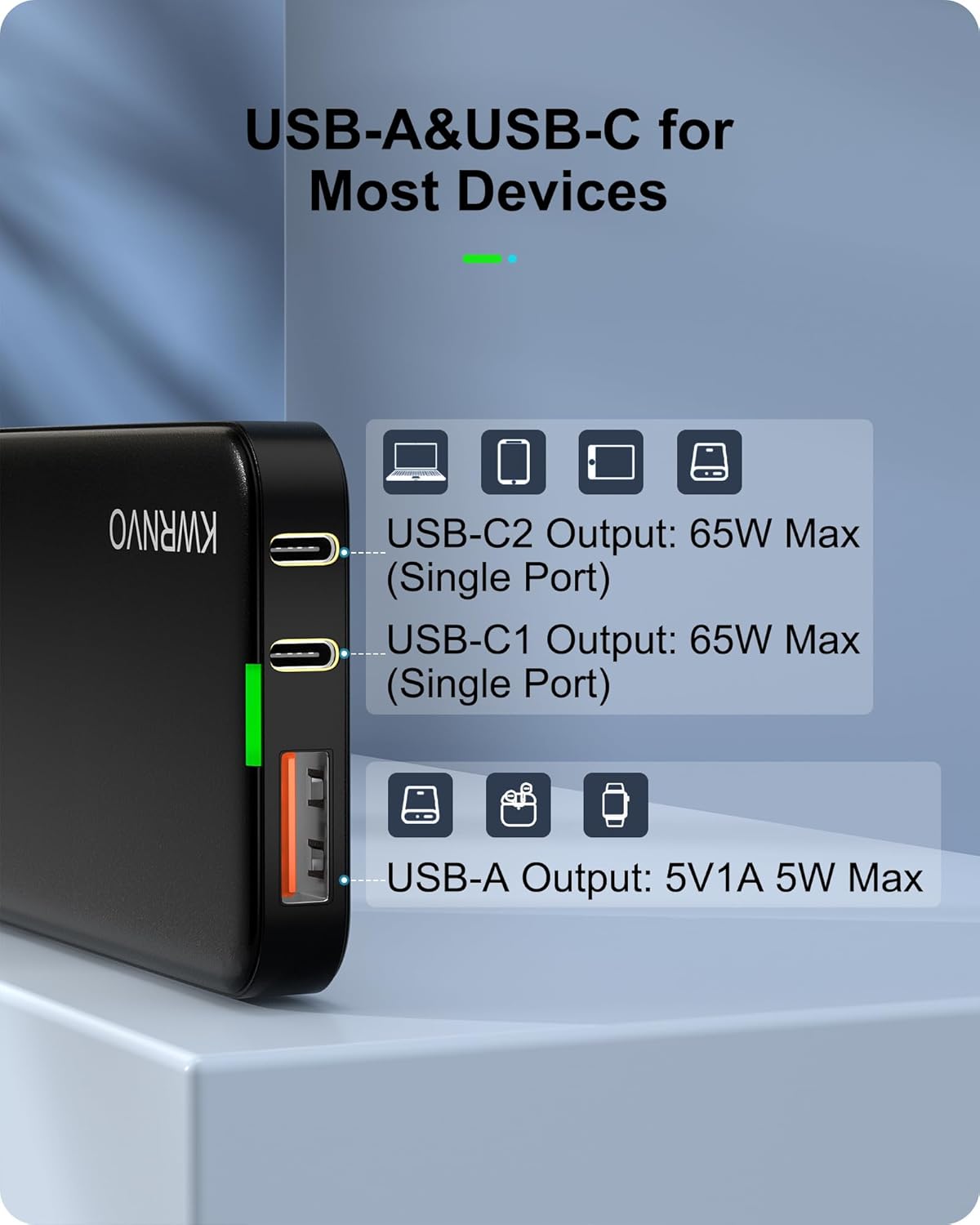 Multi Ports USB Wall Charger: KWRNVO 3-port flat USB wall charger with 2 USB-C ports and 1 USB-A port can cater to the charging needs of your diverse device collection. The USB-C port is capable of providing rapid charging for new-generation devices such as laptops, iPhone smartphones, and tablets. Simultaneously, the USB-A port comes to the rescue of your older devices, including digital cameras, iWatch, flash drives, portable audio players, mini fans, and more, allowing you to keep them in use rather than discarding them