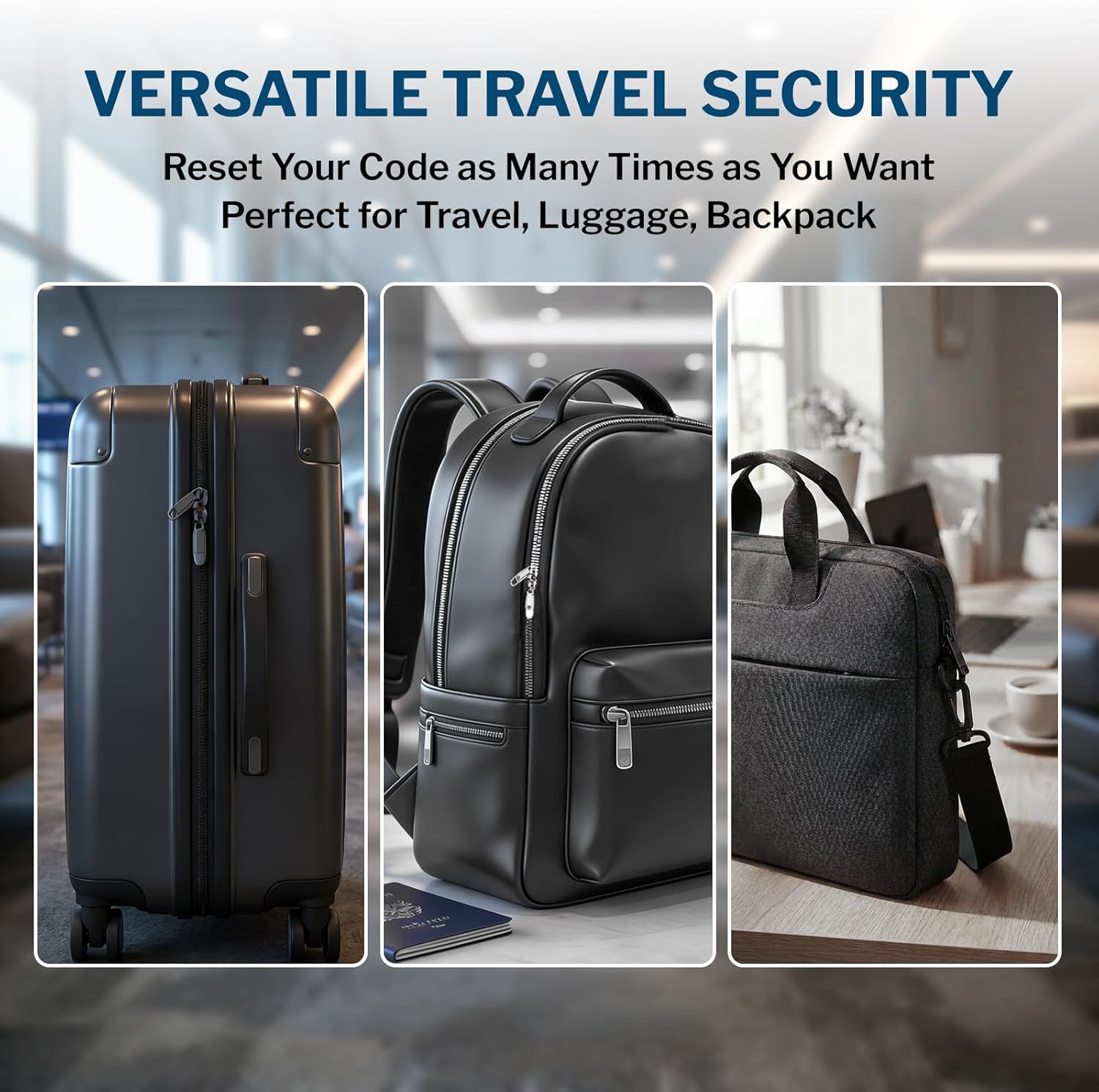 4. Compact Versatility for Travel & Daily Use. Small in size but big on security, these small tsa combination locks fit most standard zippers on backpacks, laptop bags, suitcases, and carry-on luggage. Measuring just 1.24″ x 2.45″, the lightweight zinc alloy tsa lock provides a perfect balance of portability and toughness. Whether it’s for a briefcase, pelican case, or golf bag, our versatile 3-digit resettable lock meets all your security needs.