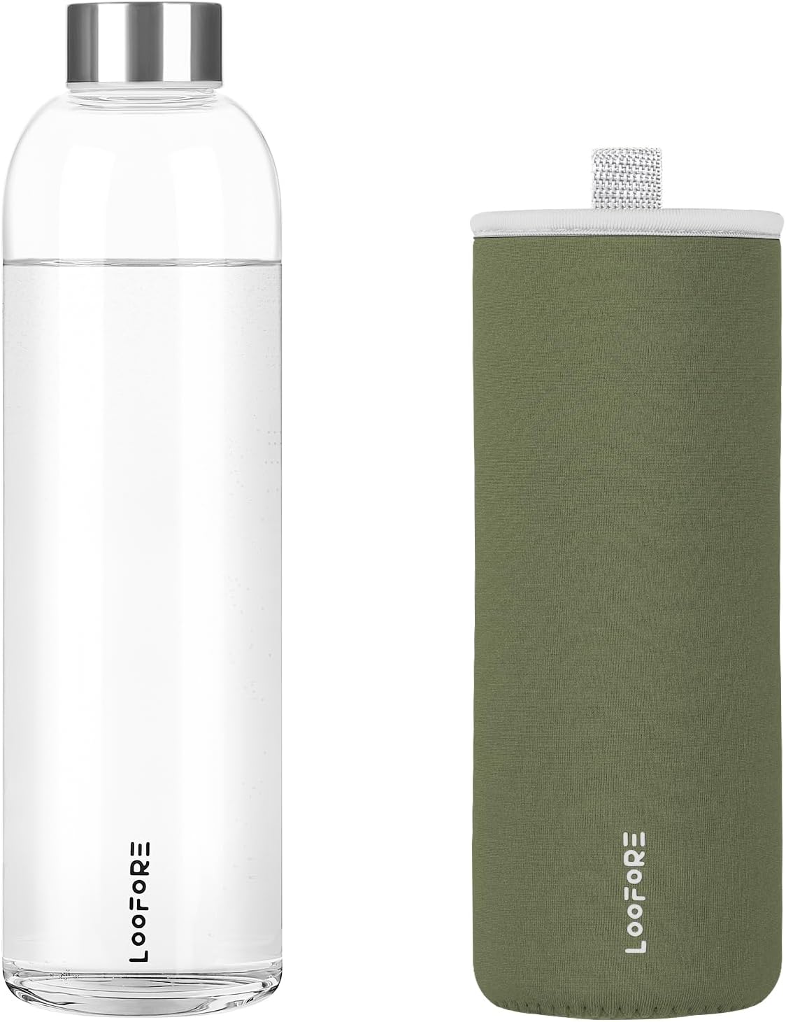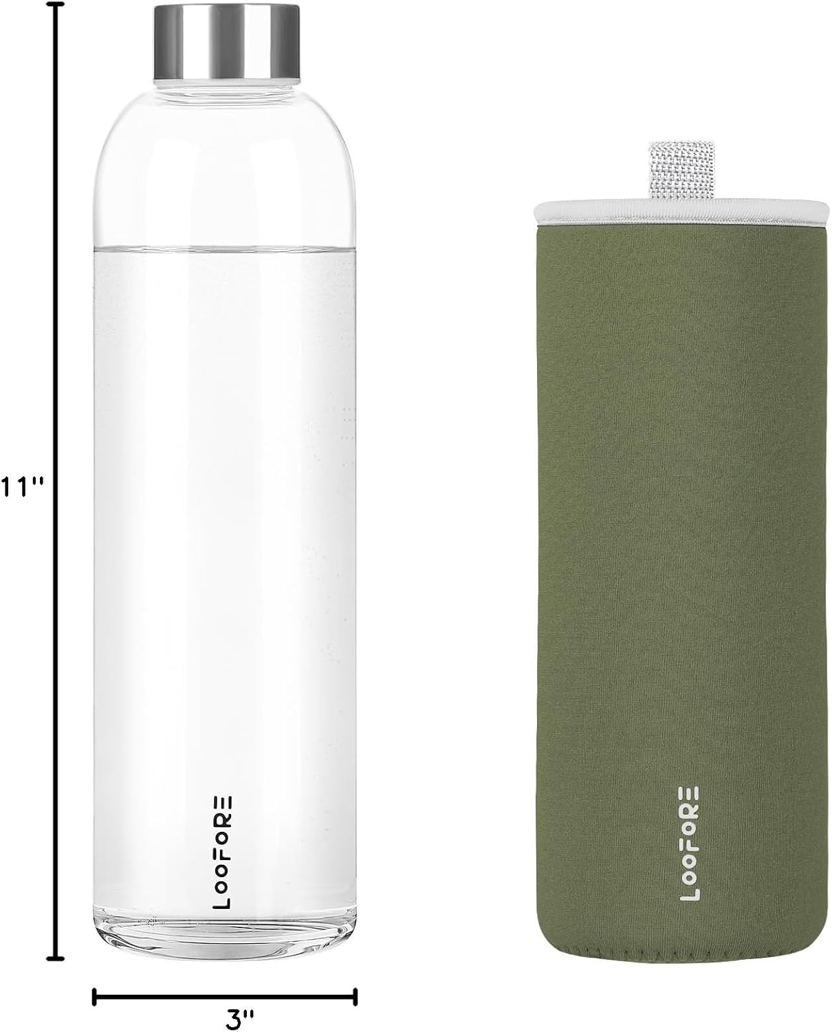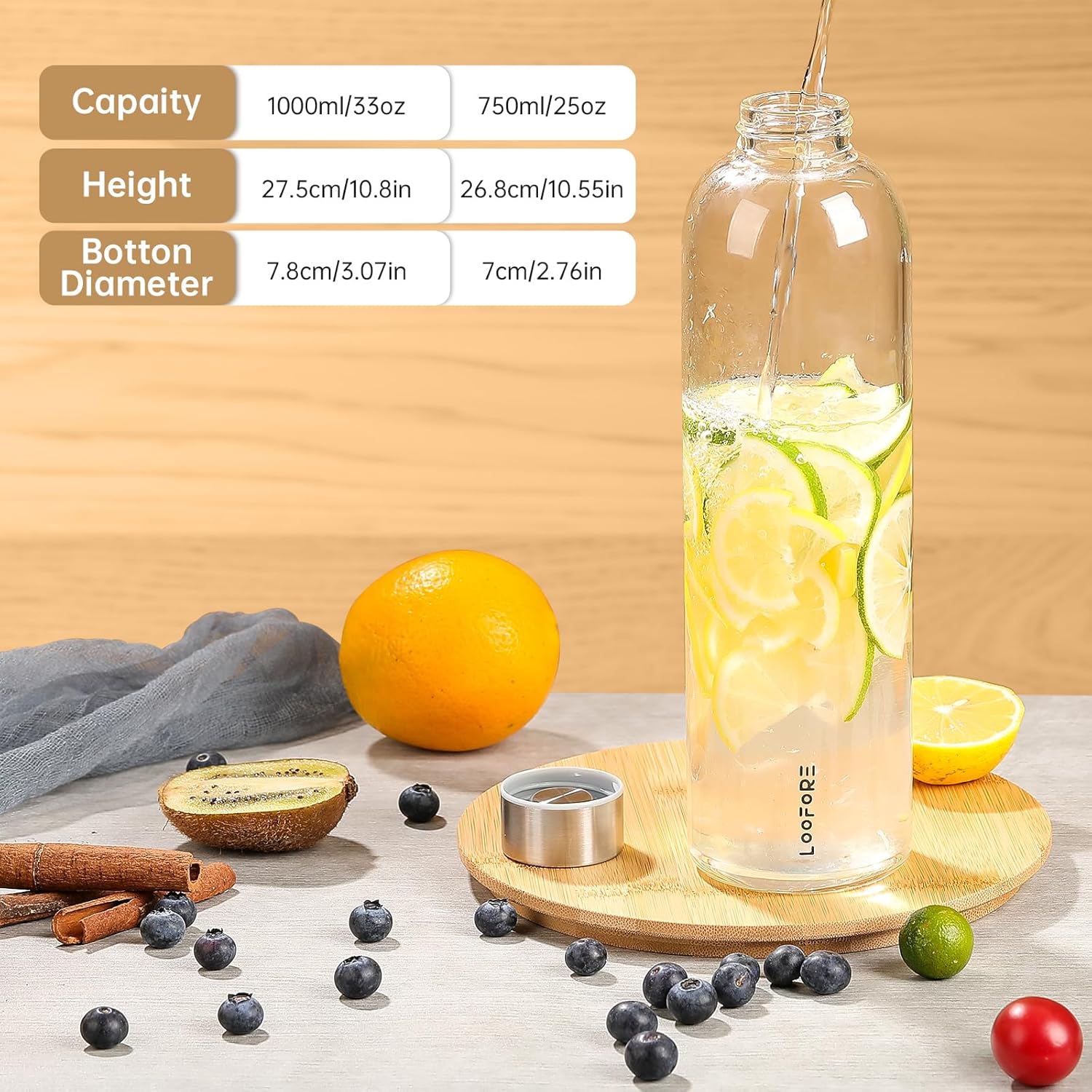 Text reads 'LOOPORE', 'Glass Water Bottle', 'Make the water taste better', 'Enjoy drinking water'. Product images showing glass water bottles with citrus fruits and berries.Text reads 'LOOPORE', 'Glass Water Bottle', 'Make the water taste better', 'Enjoy drinking water'. Product images showing glass water bottles with citrus fruits and berries.