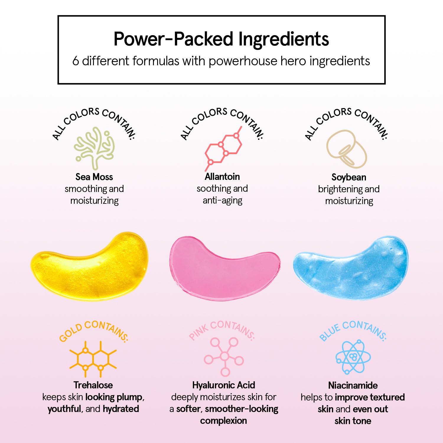 The Ultimate Eye Mask Pack – Love our undereye mask patches? Experience all 6 colors with our 18-pair variety pack. You get 3 pairs each of our gold, pink, blue, purple, bronze, and pearl under eye masks for you and your besties to refresh & relax.