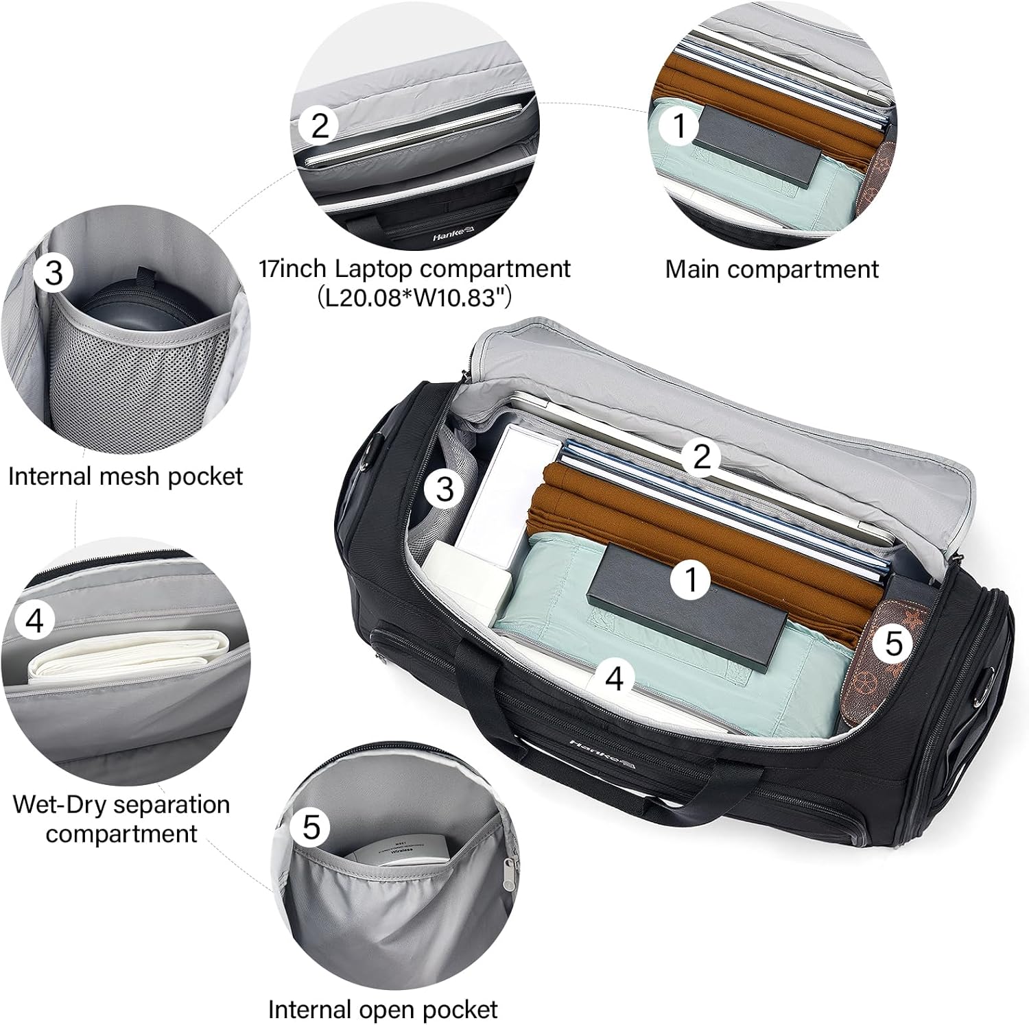 【12 Compartments】 The large duffel bag with 12 storage pockets: 1 large main compartment, 1 17inch laptop compartment, 1 large Wet-Dry separation compartment and 2 Internal open pockets,Externally with 2 large convenient front pockets, 1 side multifunctional pocket,2 side open pocket, 1 back zipper pocket and 1 separate shoe bag. Multiple pockets help you categorize and store your items in a reasonable manner,make your trips more convenient and efficient.