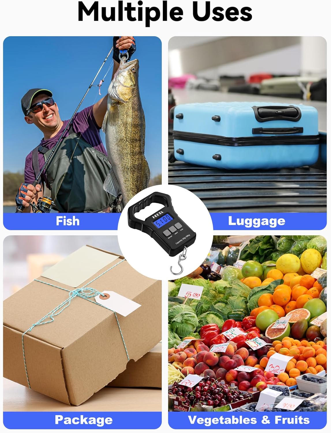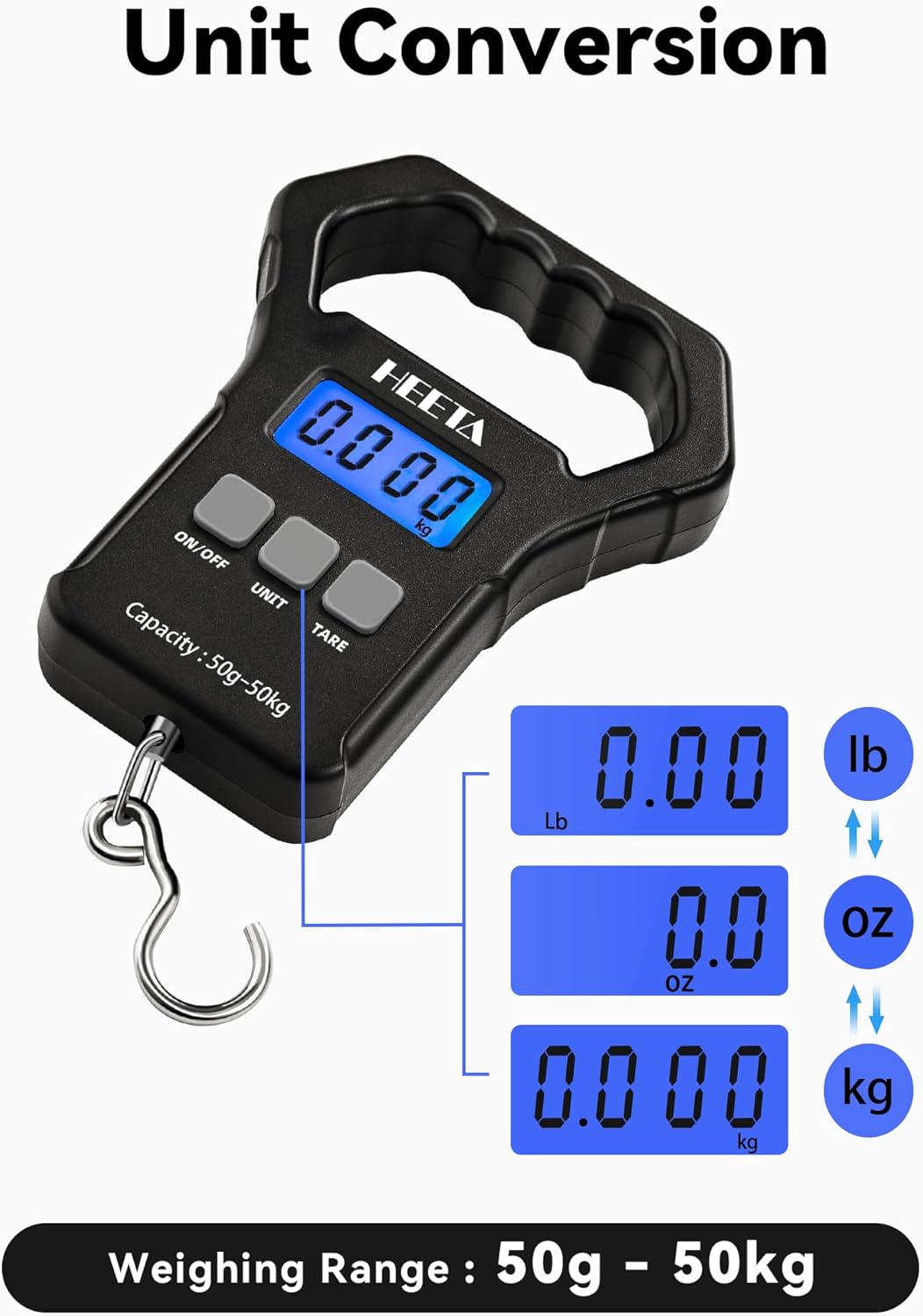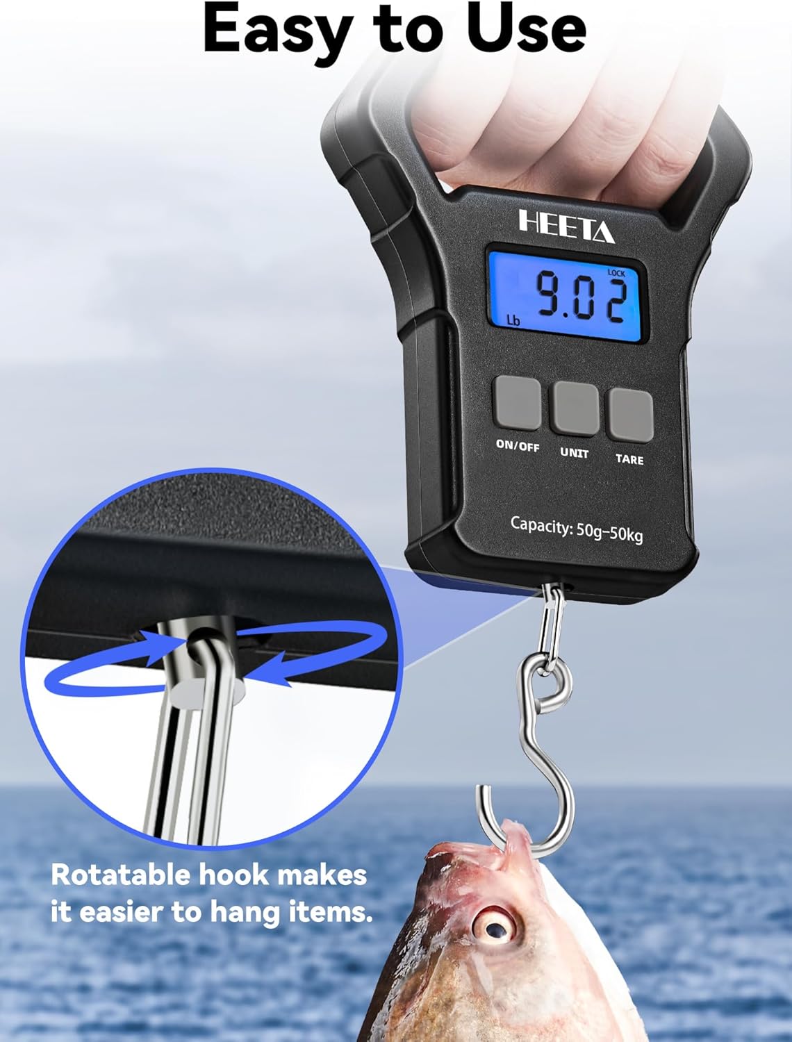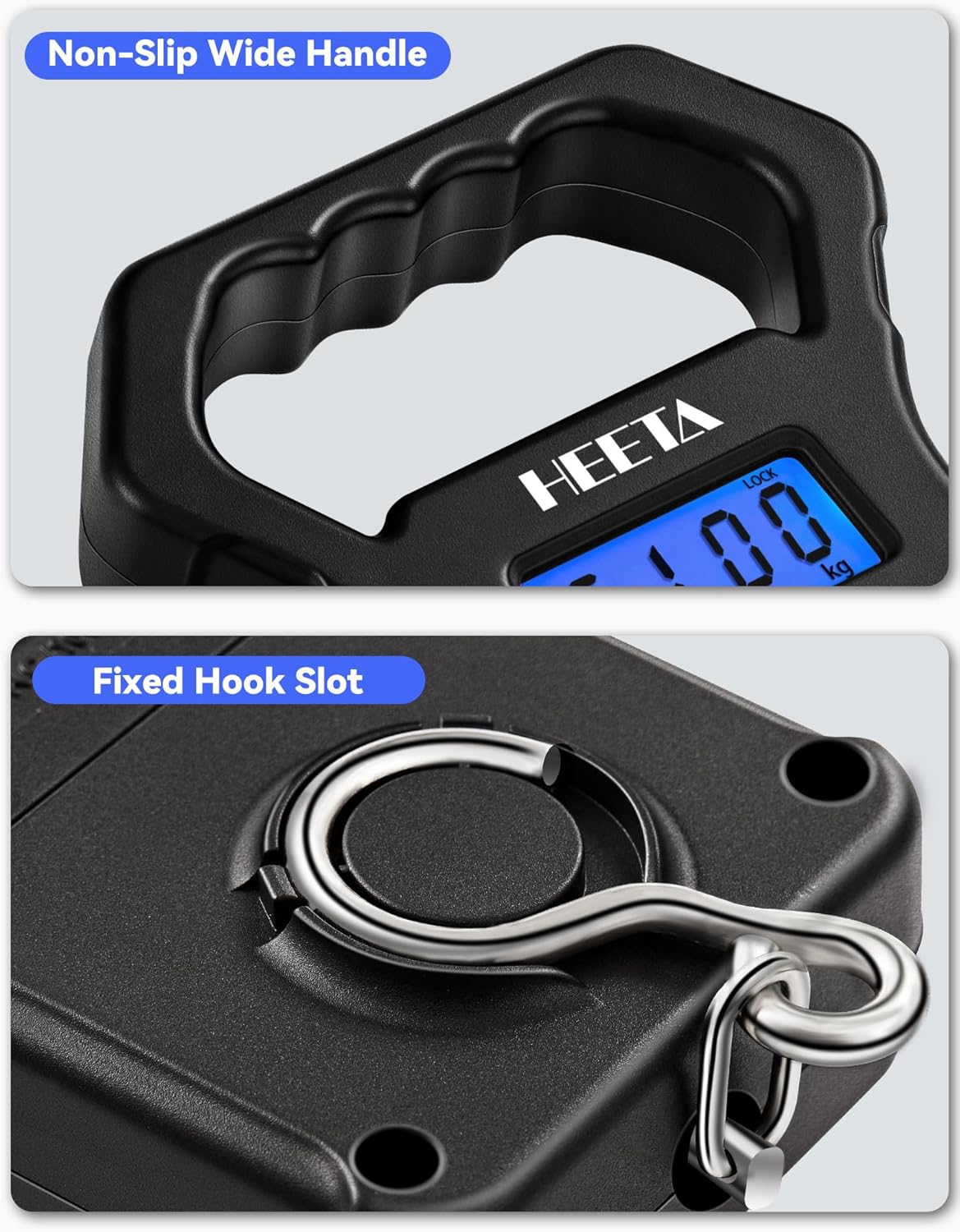 Specialized Features – HEETA electronic fish scale boasts many functions like data locking, weighing unit conversion, zero function, tare function, auto-off function and overload indication. It not only can be used to weigh fish, but also luggage, package, fruits, vegetables, etc.