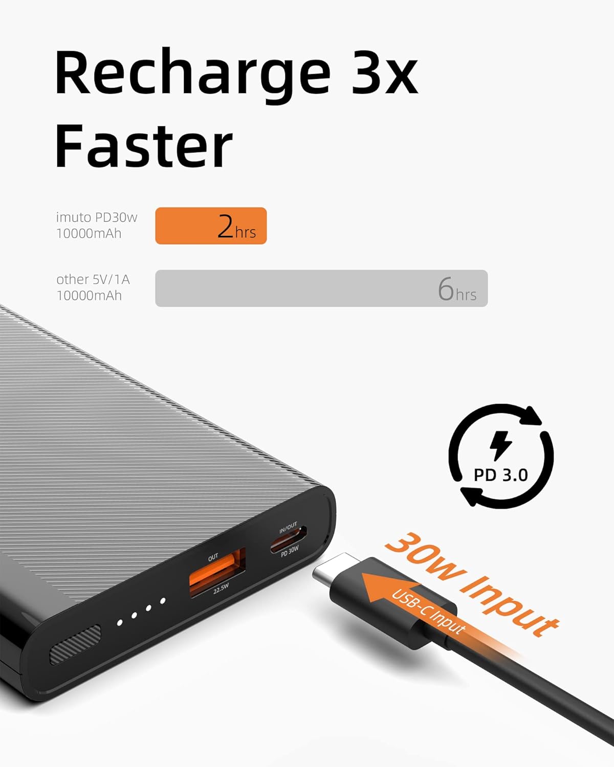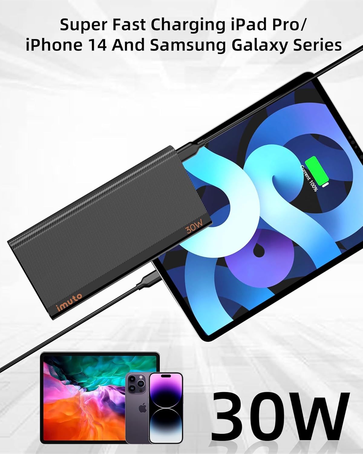 【30W High-Speed Charging】With cutting-edge fast-charging technology, the imuto 30W portable charger power bank can fully charge your iPhone 14 in just 2 hours, over twice as fast as traditional 2.4A and 2.1A charger.