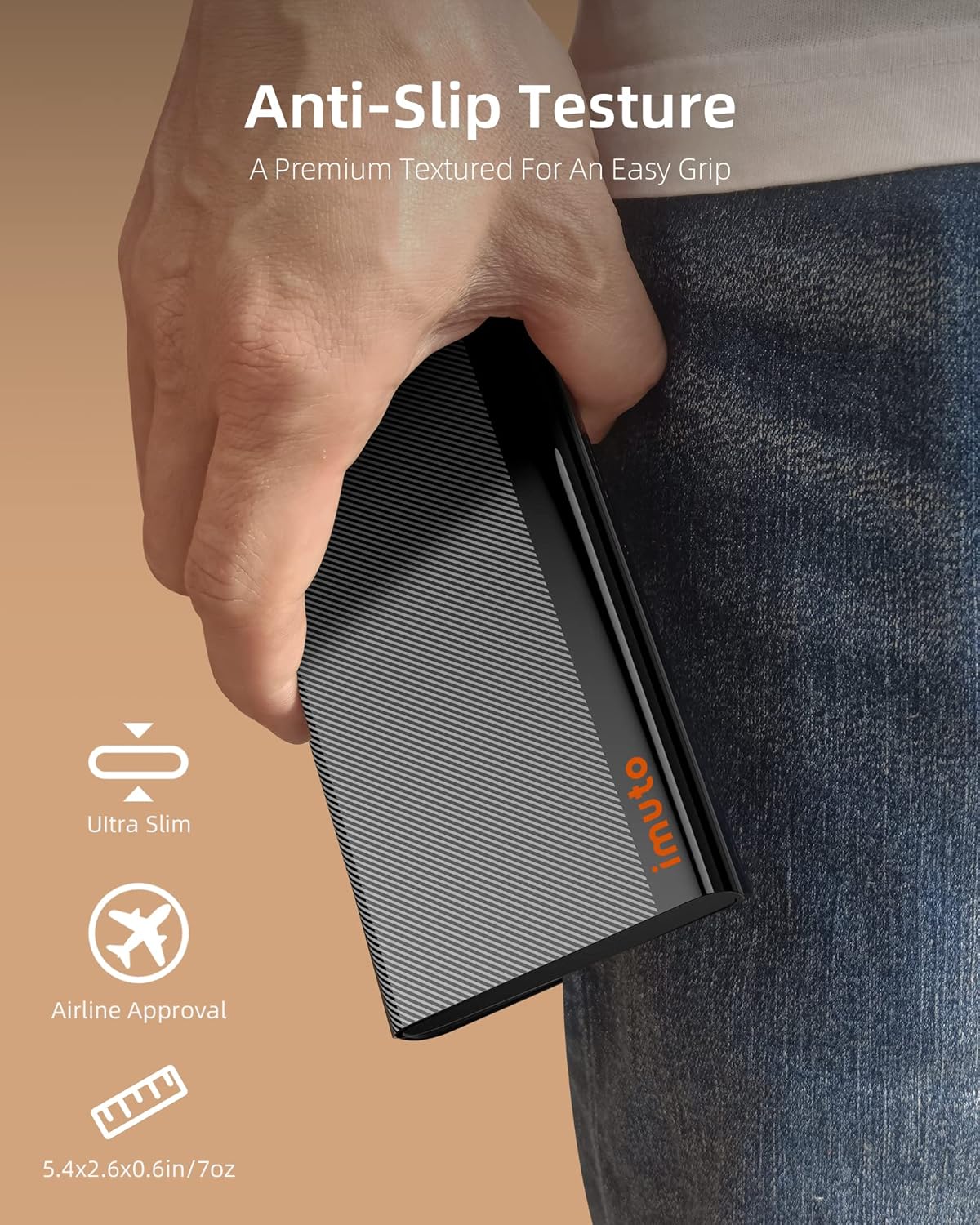 【Ultra Slim 10,000mAh】Compact and lightweight, the imuto 10,000mAh battery pack measures just 5.4 × 2.6 × 0.6 inches and weighs only 7 ounces, fitting effortlessly into any traveler’s pocket or bag. It’s 35% thinner, 20% smaller, and 30% lighter than similar products and is approved for airplane travel.