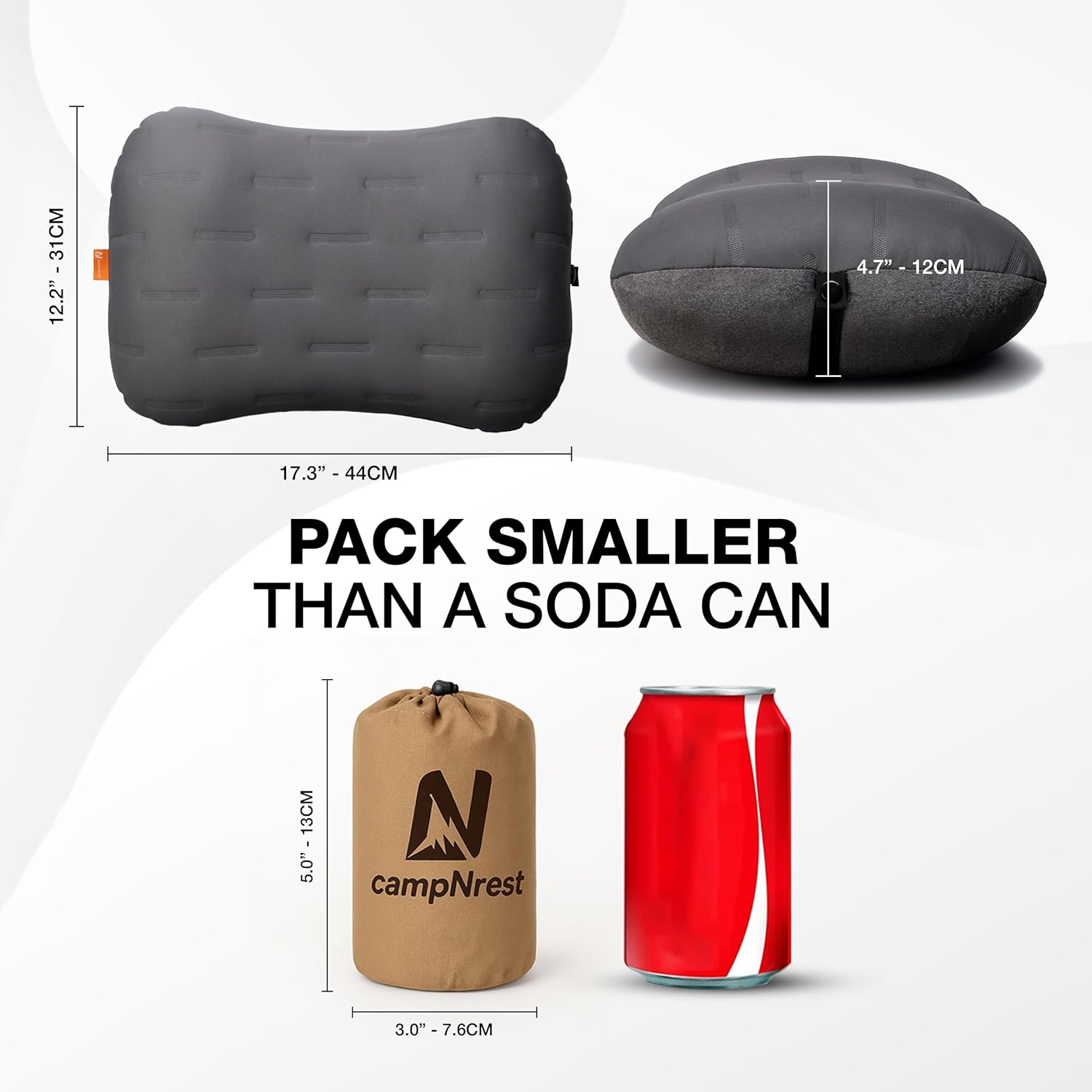 ULTRALIGHT & PACKS DOWN SMALLER THAN A SODA CAN: Weighing less than your phone, this compact inflatable pillow folds to a palm-size pouch—perfect for camping, backpacking, hiking, travel, and minimalist packing. Fits easily into a backpack side pocket, fanny pack, carry-on, or even cargo pants.