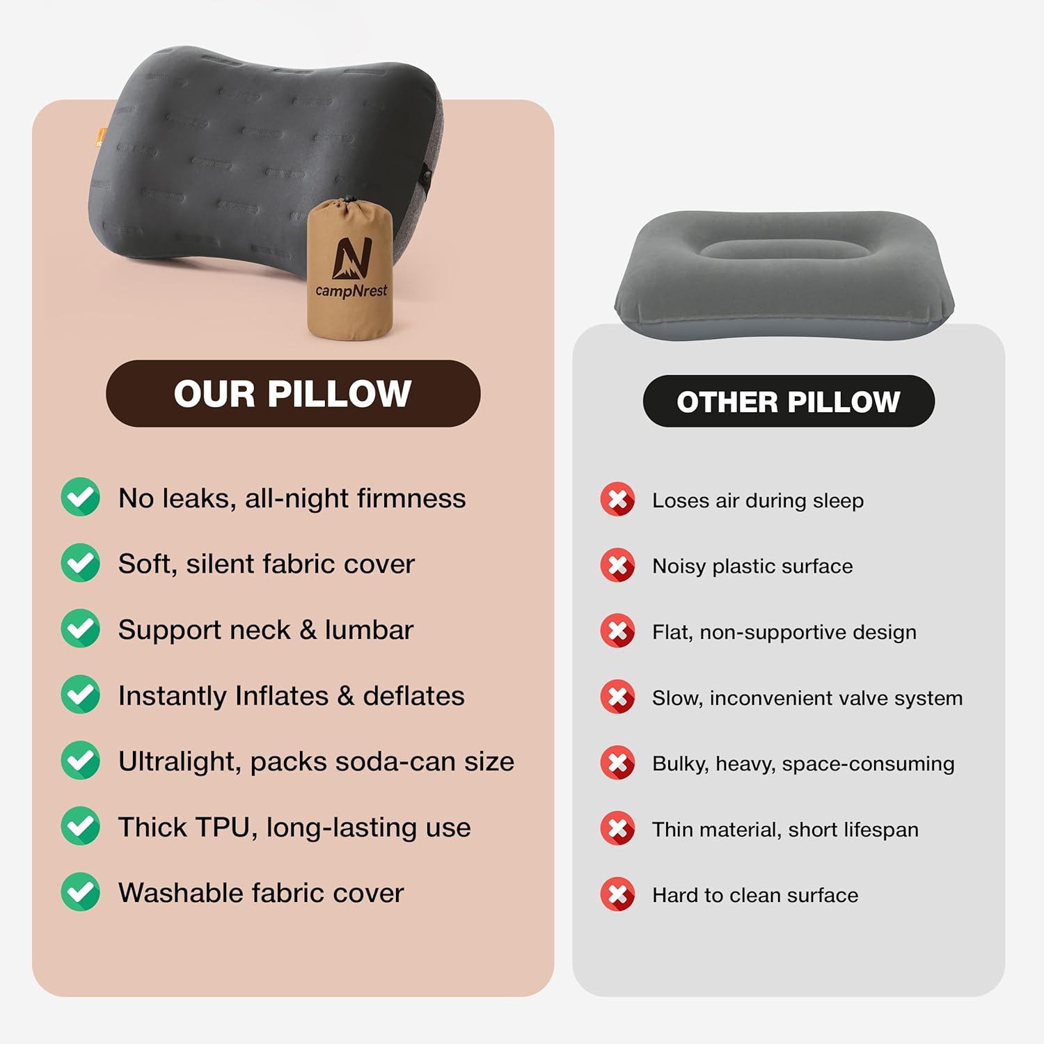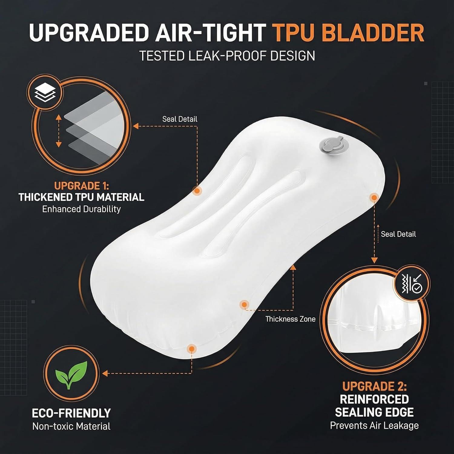 NO-LEAK THICK TPU BLADDER FOR RELIABLE SUPPORT : Made with a durable, thickened TPU air bladder, this inflatable camping pillow prevents air leaks and maintains consistent firmness all night. Designed for outdoor conditions, it provides stable neck and lumbar support while camping, hiking, backpacking, or traveling. Built to withstand repeated use without losing air pressure.