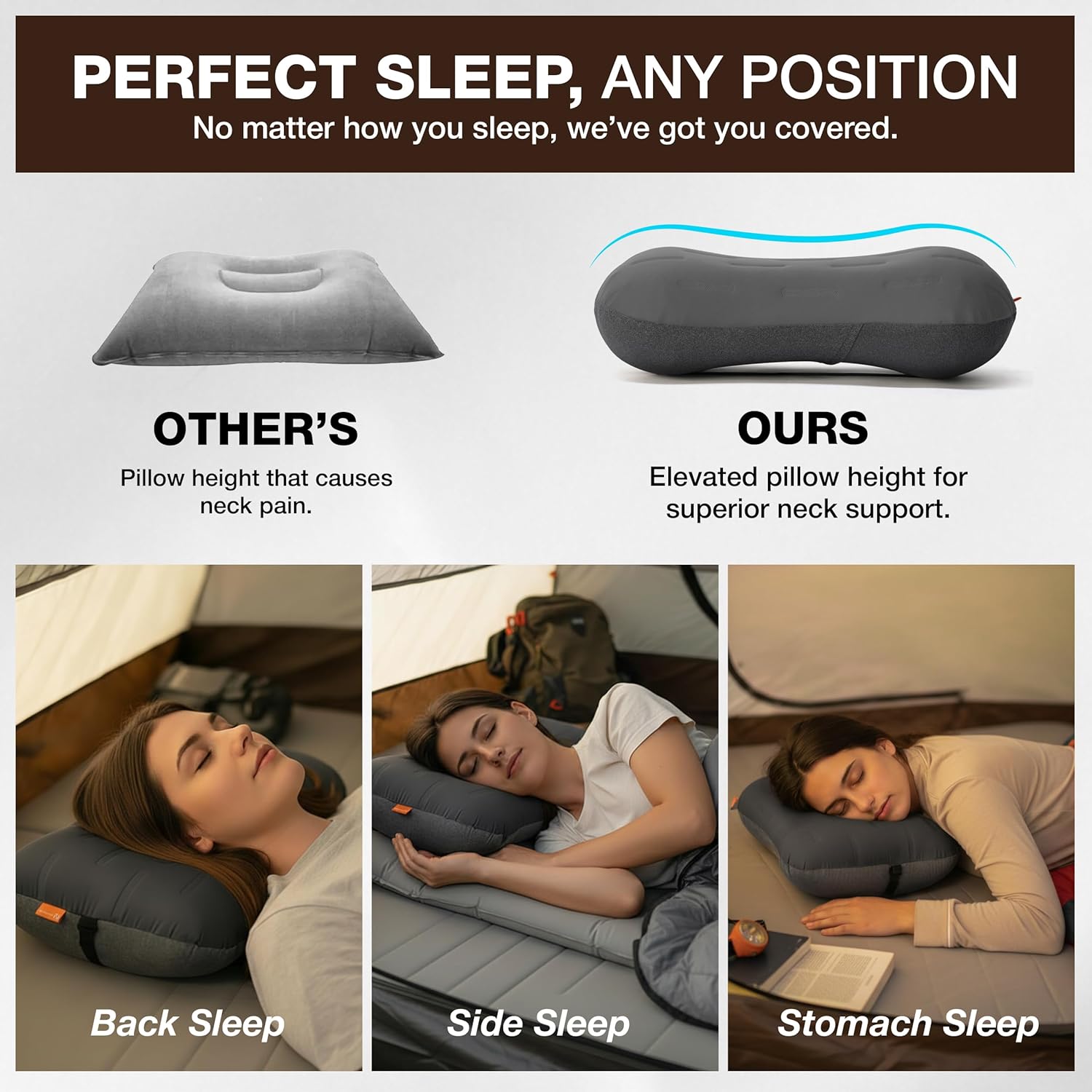 ERGONOMIC ADJUSTABLE HEIGHT FOR ANY SLEEPING POSITION: Engineered to match natural neck curvature, this ultralight air pillow supports back, side, and stomach sleepers. Customize firmness and height through the easy-adjust valve. Also functions as a lumbar cushion for long drives, flights, office chairs, and backpack rest breaks.