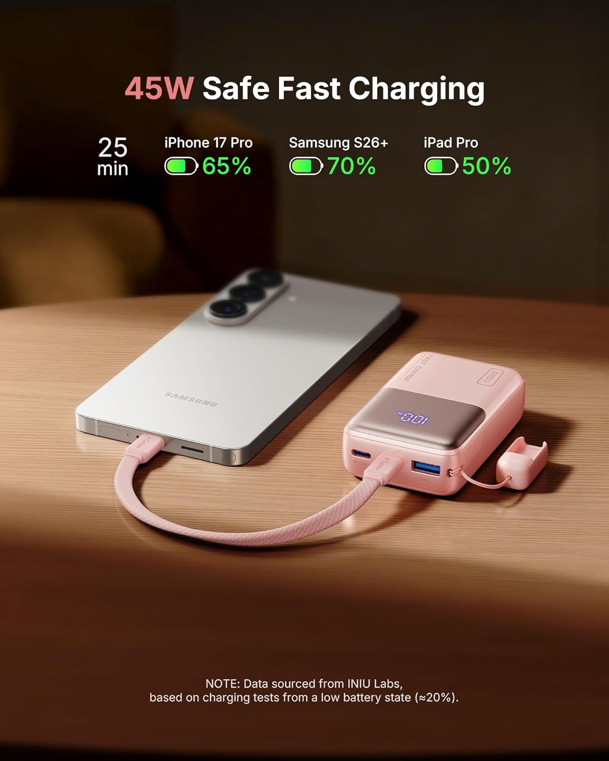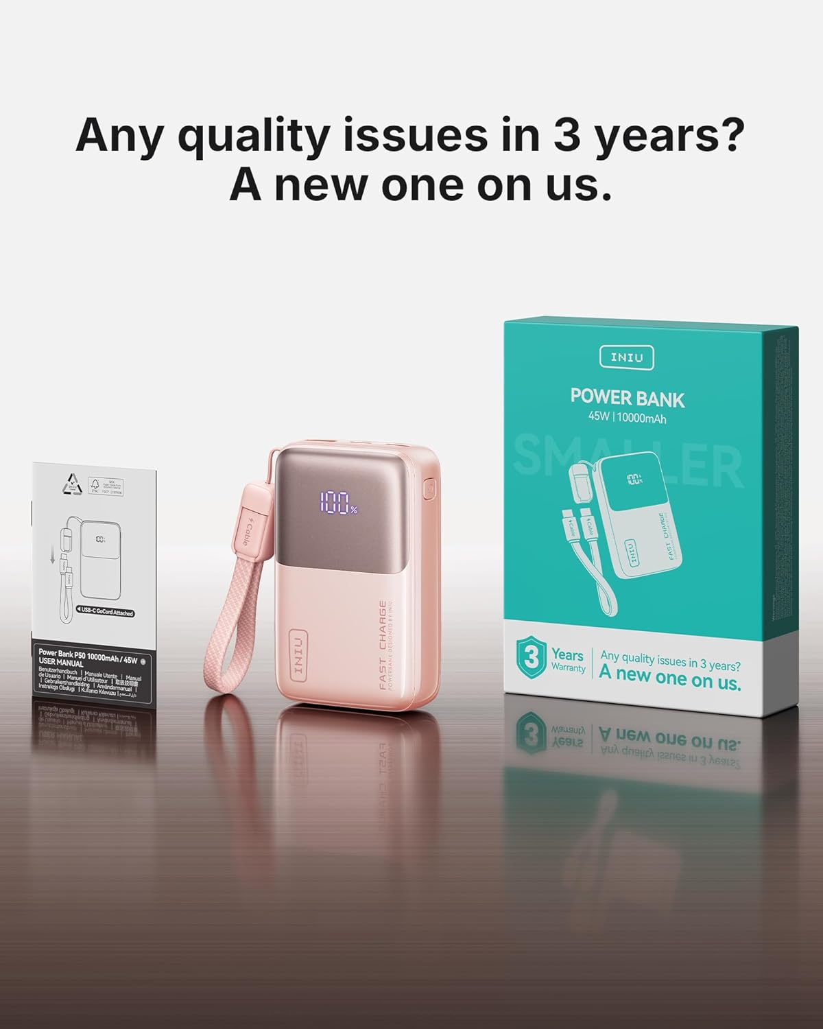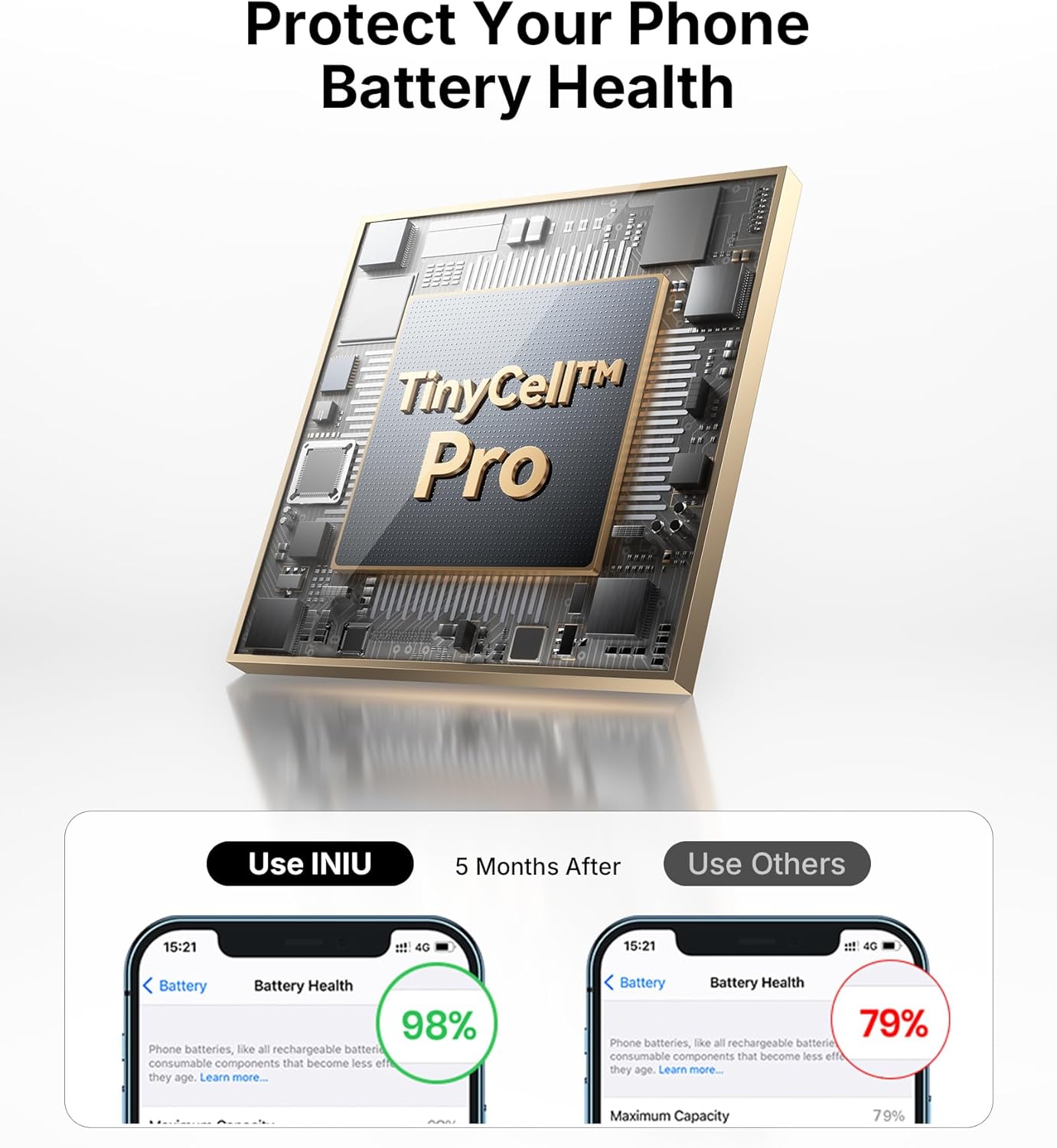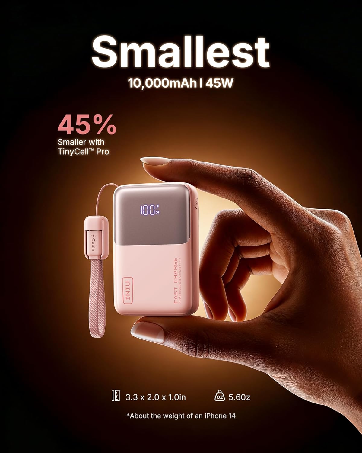 INIU Redefine Smallest 10000mAh: INIU’s latest 10,000mAh power bank, featuring the industry-first TinyCell Pro battery, redefines the industry standard for the smallest size. It’s 45% smaller than the standard 10,000mAh—seeing is believing!