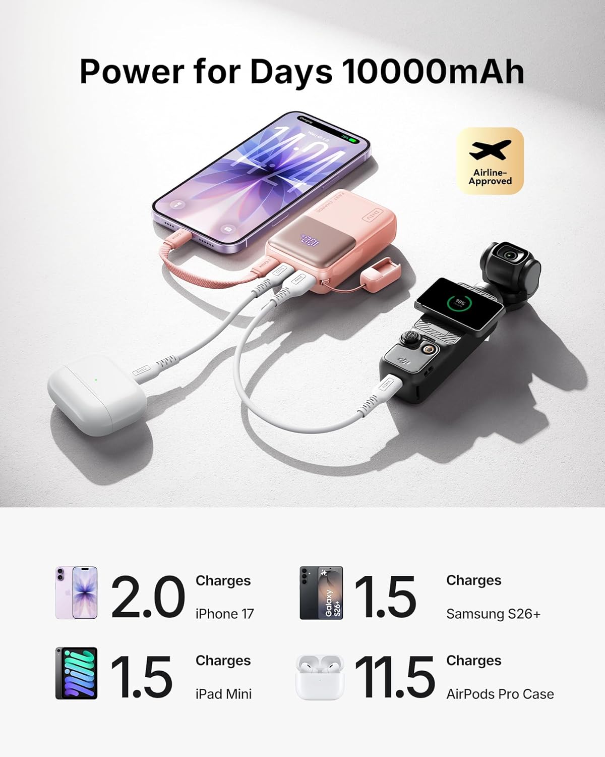 Power for Days 10000mAh: If you’re looking for a power bank that covers daily use, short trips, and business travel, 10,000mAh is the perfect choice. It can charge your iPhone 16 twice, your Samsung S24 1.5 times, and your iPad mini 1.5 times.