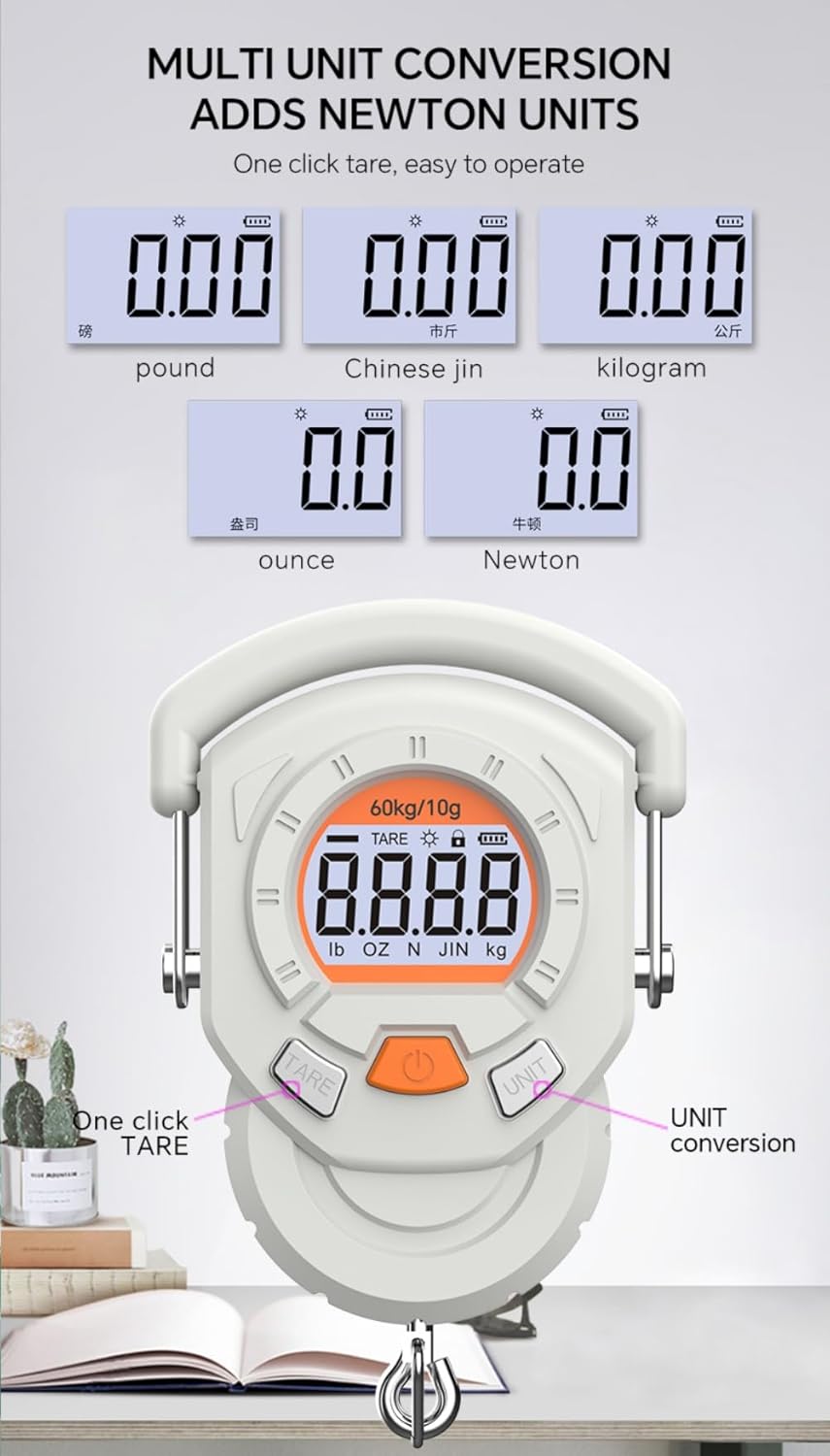 ✅ Tare,KG/OZ/JIN/LB/N unit conversion functions,once you first set the units to pounds,the memory keeps it there,so every time you turn the crane scale on it is ready to go;Auto zero resetting/power off after idle for 120 seconds;Over-load/Low battery indication.