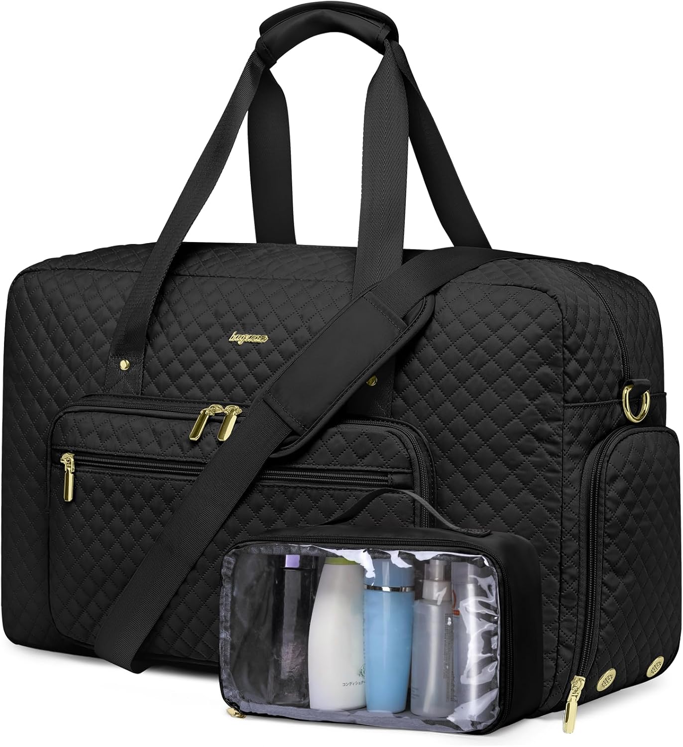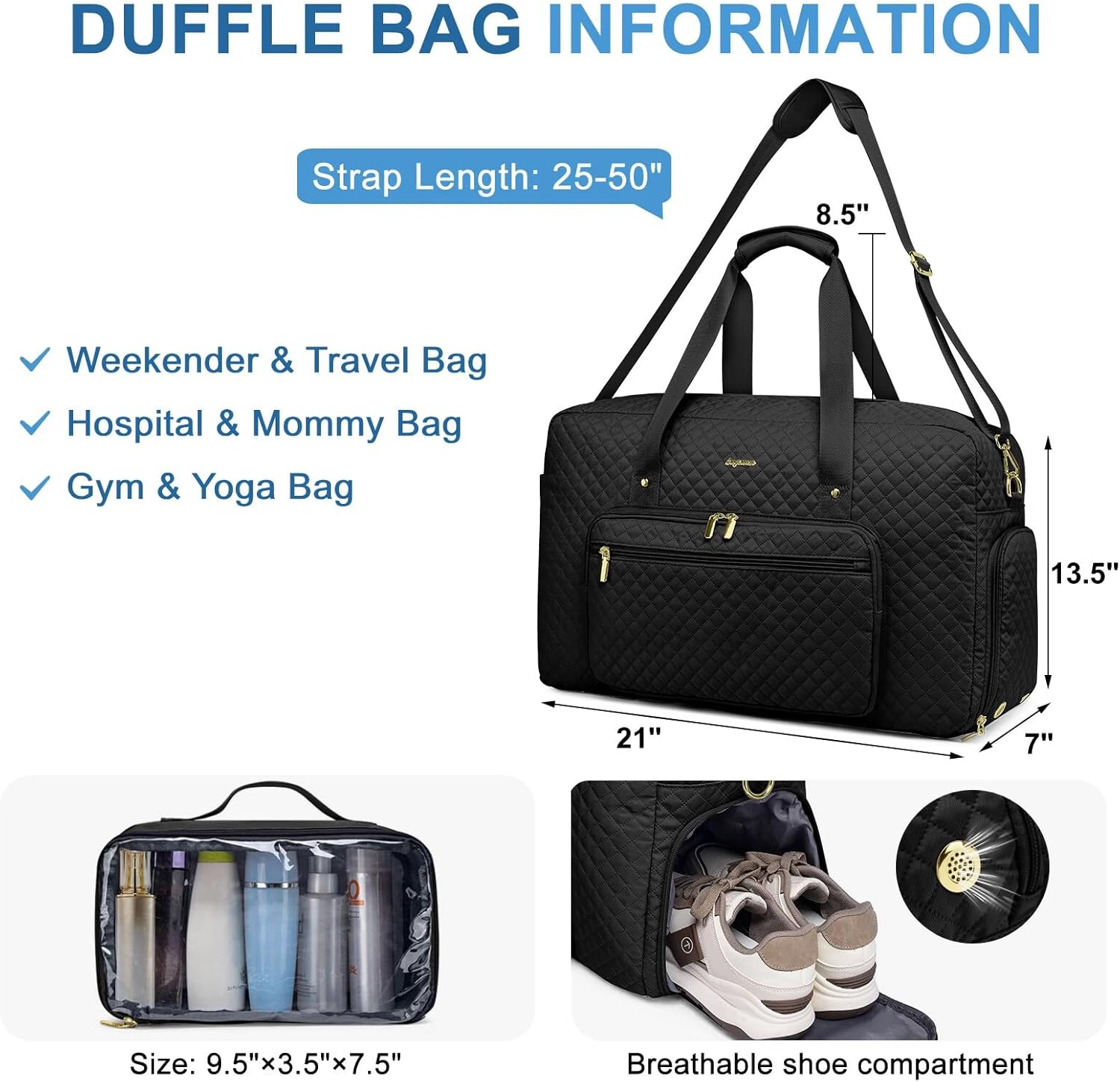 WITH A TOILETRY BAG & SHOE COMPARTMENT: Overnight bag includes a complimentary toiletry bag (a $10 value), perfect for keeping your toiletries and makeup organized. Women duffel bag also features a separate shoe compartment on the side to keep shoes away from clean clothes, with two ventilation holes to help air out any odors. For new moms, it can also be used as a hospital bag, mommy bag, or medical bag.