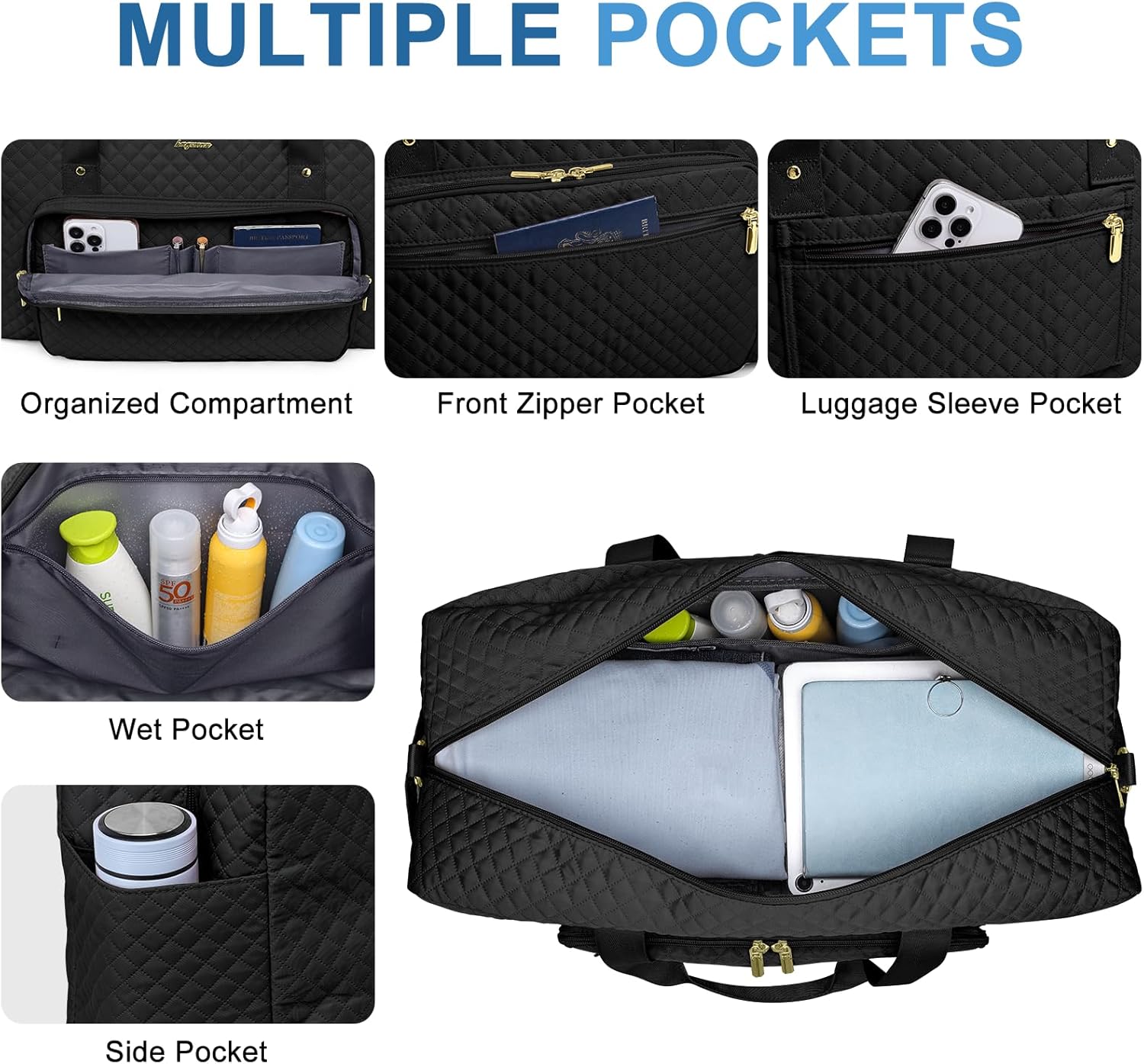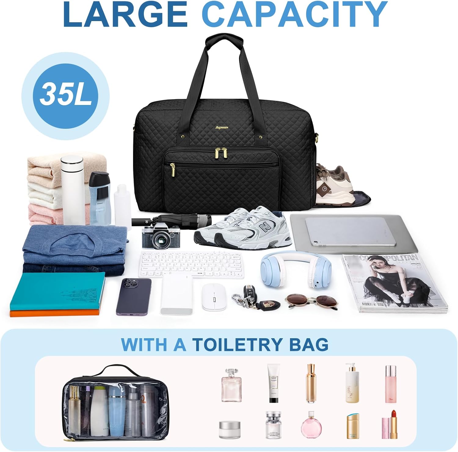 LARGE CAPACITY & MULTIPLE POCKETS: This duffle bag measures 21×7×13.5 inches and boasts a 35L capacity, offering plenty of room for a 3-5 day trip! It comes with multiple pockets to keep your items organized, plus a PVC waterproof zipper pocket to keep wet and dry items separated. Stylish yet practical, weekender bag for women is the perfect choice for travel, gym, and outdoor activities.