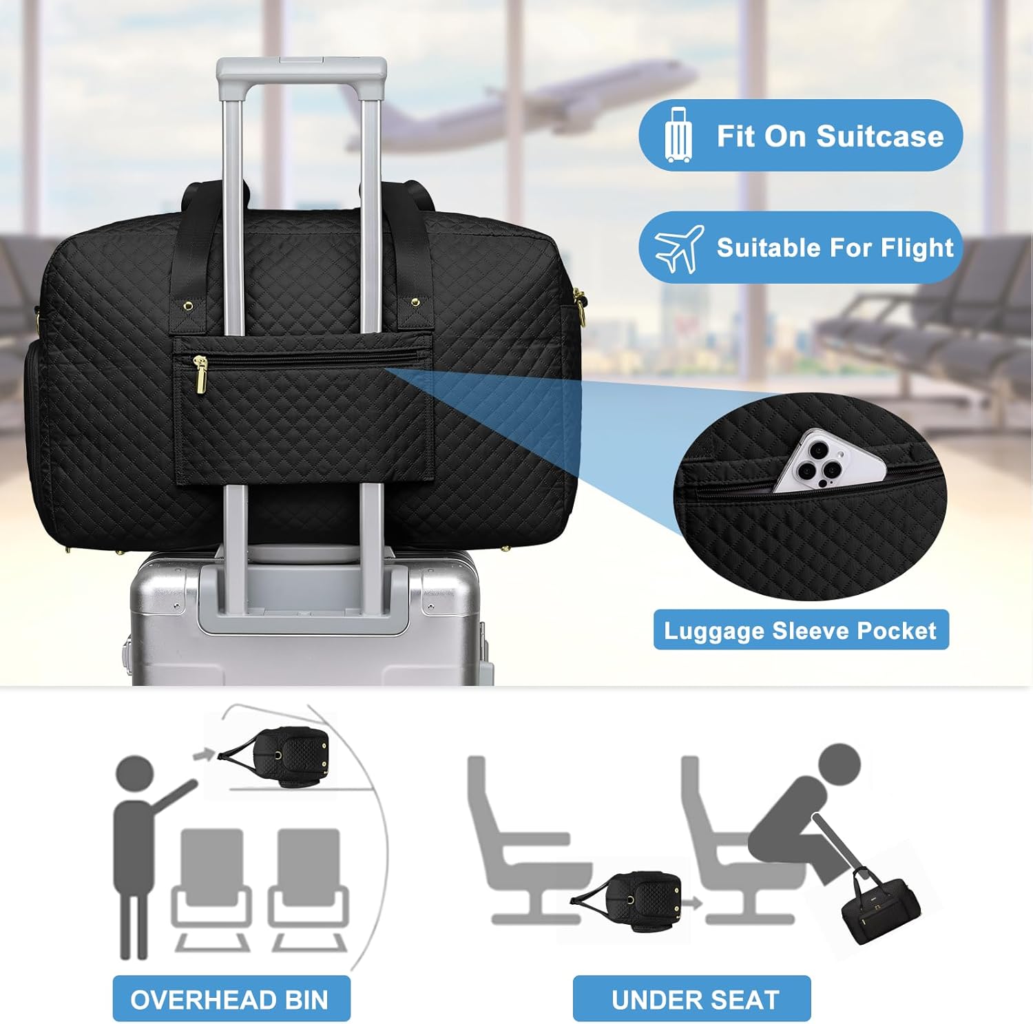 AIRPLANE FRIENDLY CARRY ON BAGS: The Overnight bag for women meets most international carry-on requirements. It fits as a personal item in overhead bins and under seats during flights. The luggage strap on the back attaches securely to your suitcase handle, freeing your hands for effortless airport travel. A back zipper pocket keeps your smartphone, ID, or passport secure and within reach.