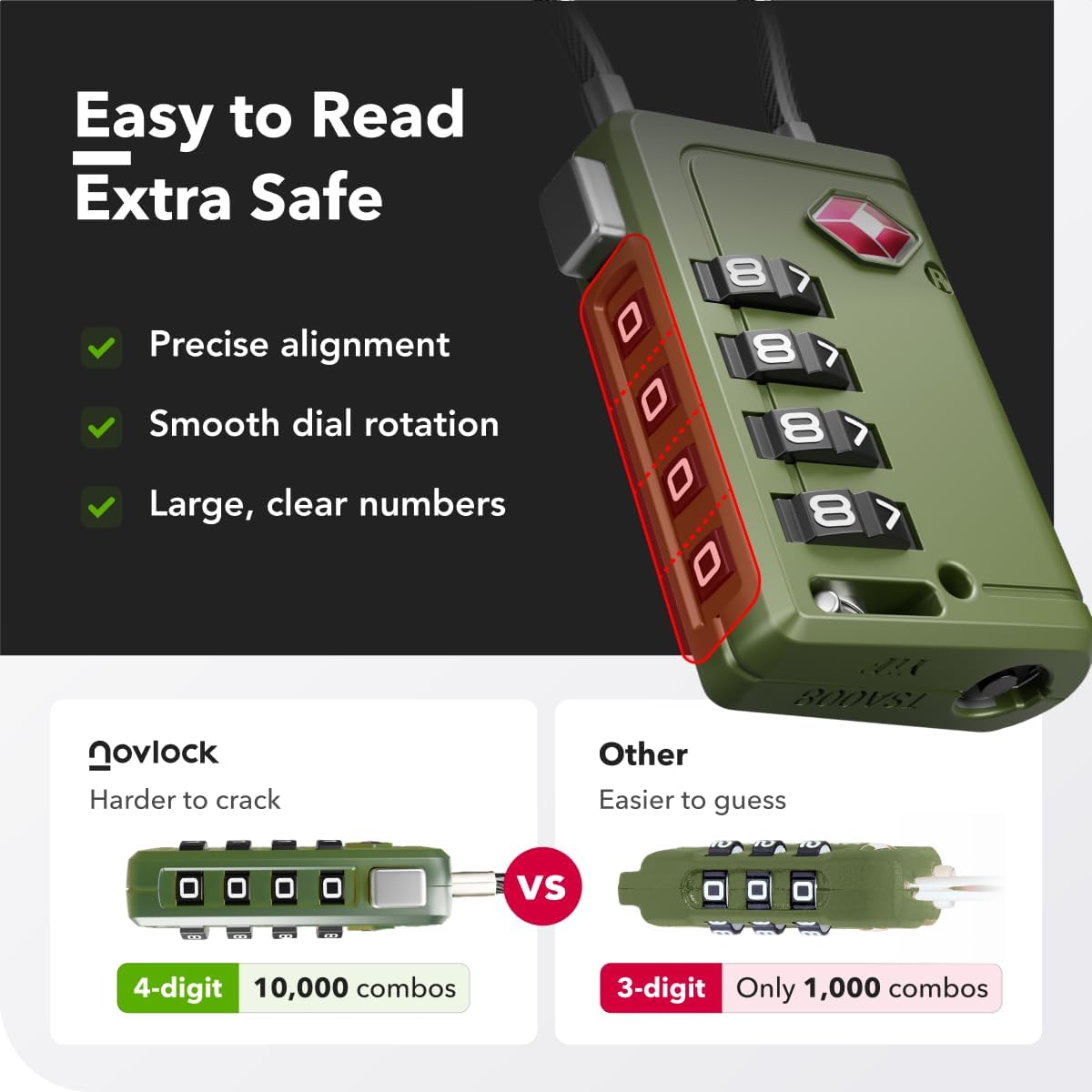 【Extra Secure & Easy to Use】The 4-digit TSA approved lock offers 10,000 unique combinations, 10X more secure than standard 3-digit locks. Features an upgraded side reset switch for easy setup and resetting. The push button release opens the cable with one press. Smooth-turning dials align clearly and feature bold, high-contrast numbers for easy reading.