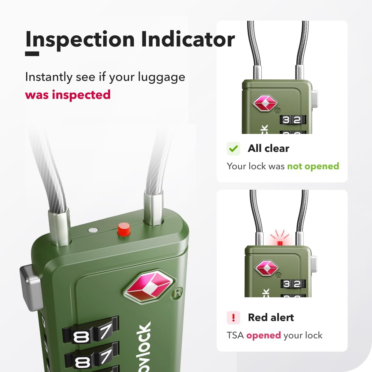 【TSA Accepted & Inspection Indicator】All our suitcase locks are TSA approved. At 750+ airports in 75+ countries, TSA agents can inspect and relock your luggage without causing damage. A red indicator pops up when the combination lock has been opened, so you’ll know if your luggage was inspected.