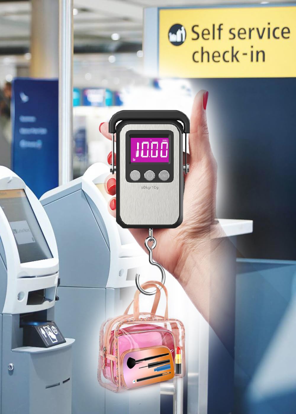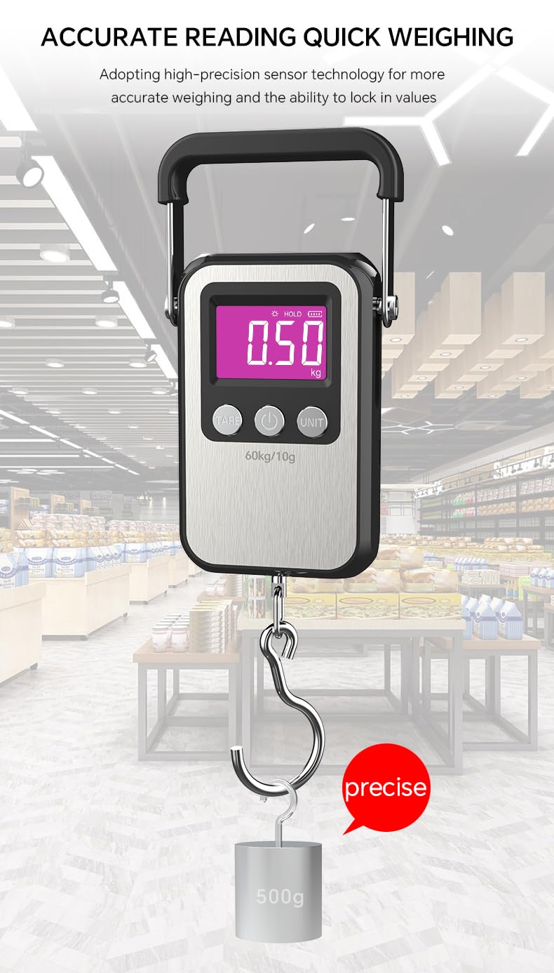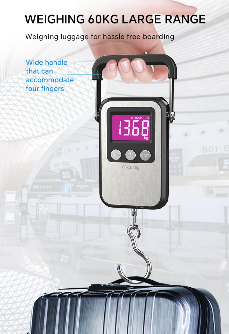 The digital luggage scale provides capacity and accuracy: min.cap.50g/0.11 lb and the max.cap.60 kg/132 lb. graduation increments of 10g/0.03 lb.