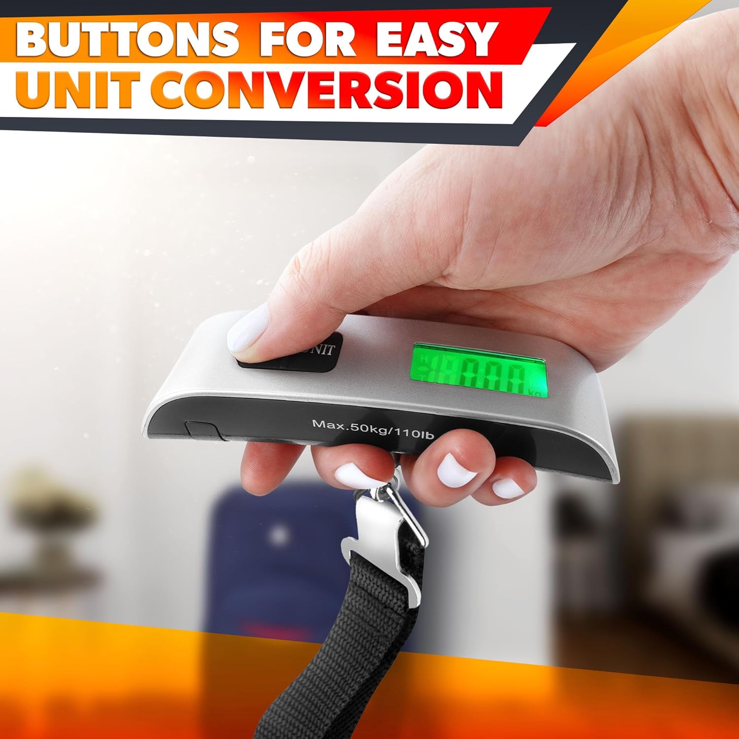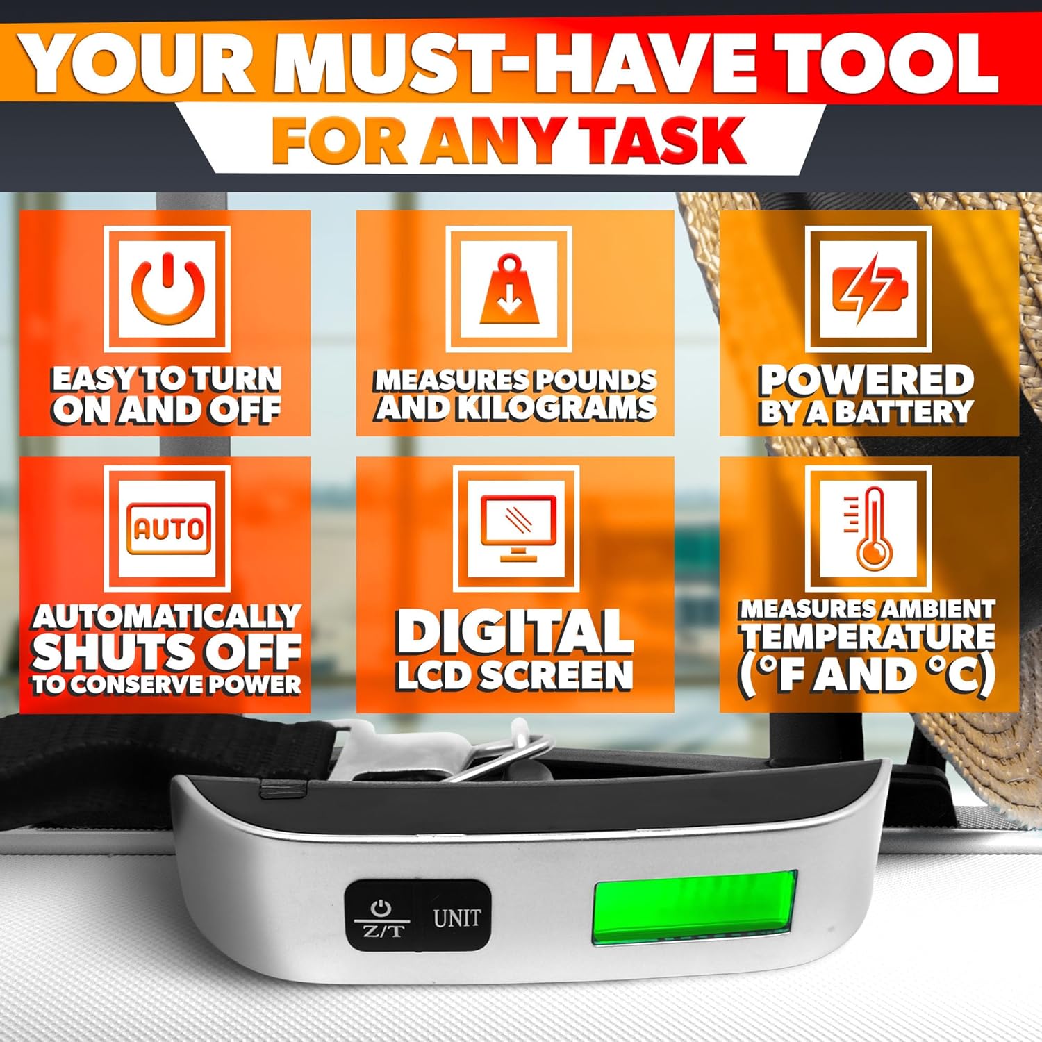 Portable Luggage Scale for Travel: The baggage weight scale comes with strap and durable steel hook, convenient for suitcase and packages. With our scale, hook your suitcase for instant weight. This luggage scale travel digital device is compact and practical for any trip.