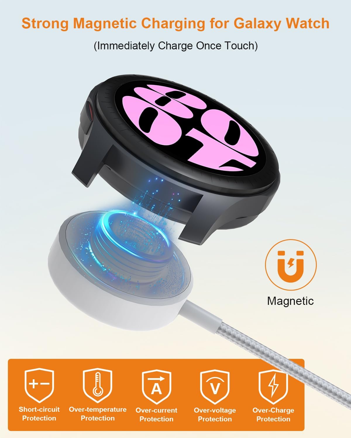 Magnetic Adsorption Design: Samsung watch charger has built-in overcurrent, overvoltage and overtemperature protection to provide a safe environment for charging the watch. In addition, it also has powerful magnetic adsorption function. Just hold the connector close to the back of your smart watch and the wireless watch magnet will automatically pull it into place, stably charging your Samsung watch