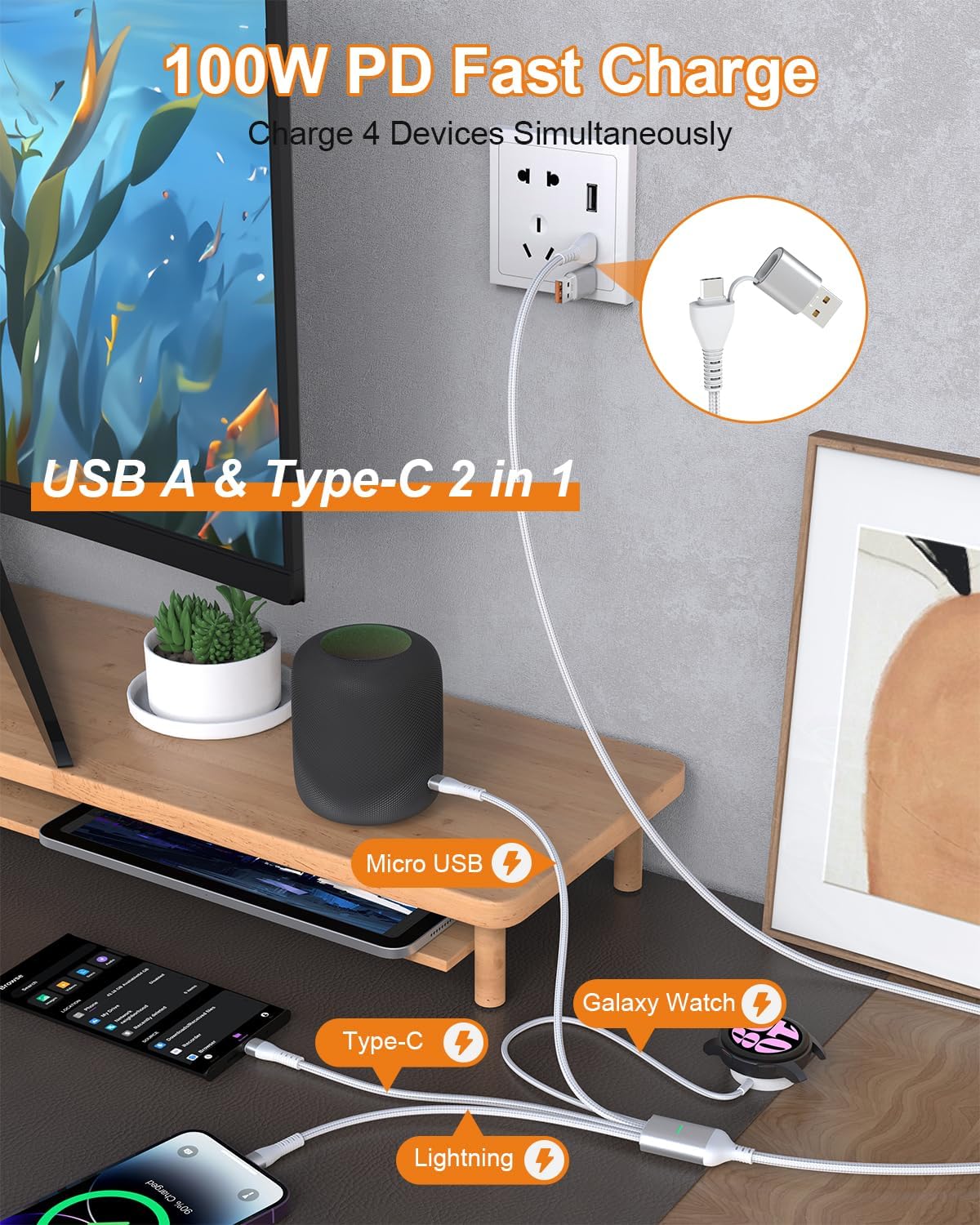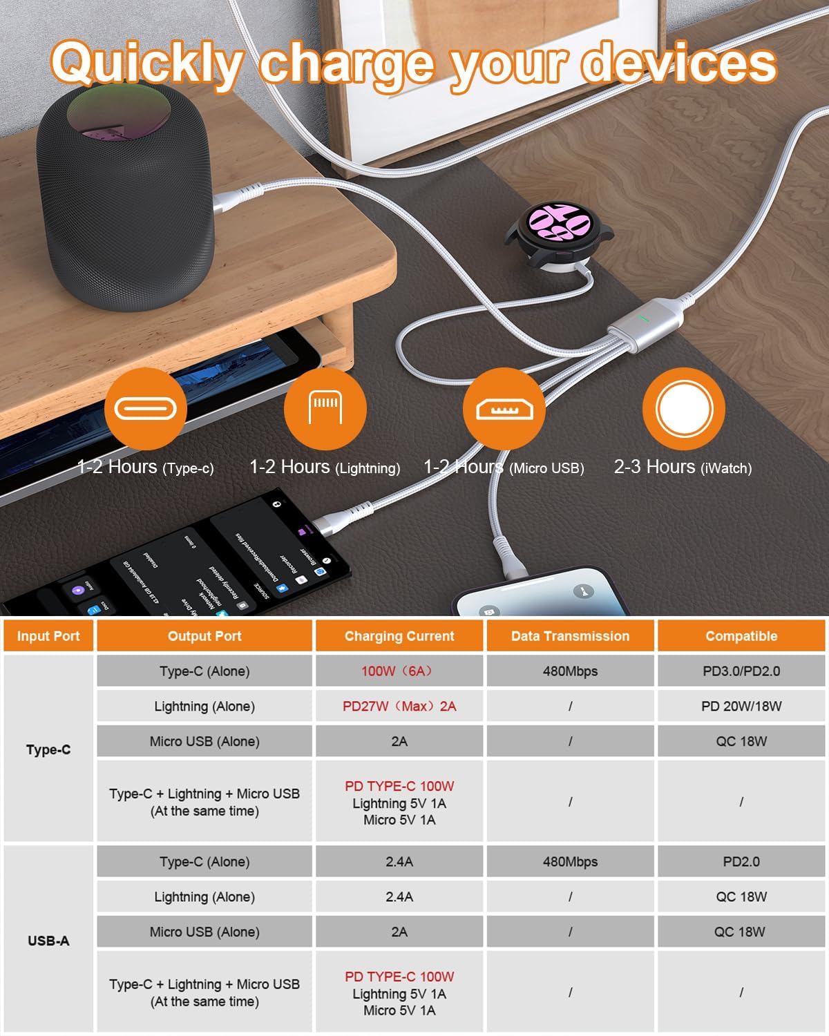 Designed with USB A and USB C 2 in 1 input interfaceFeatures four output interfaces: Micro USB, Lightning, Type C and Samsung watch chargerSupports charging 4 devices simultaneouslyUSB A/C to Lightning cable is MFI certifiedUSB-C to USB-C port provides charging speeds up to 100W (max)Type-C output supports 480Mbps data transmission (other outputs only support charging)LED status indication (red light turns on when powered on, green light turns on when charging)