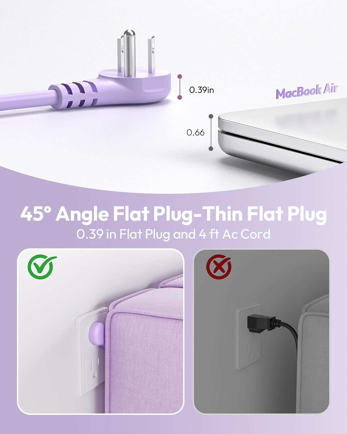 【Flat Plug Power Strip】: The ultra thin flat plug is only 0.39 inch, and practical since it allows you to accommodate a piece of furniture without leaving space. The 4ft extension cord flat plug with 45-degree right-angled will not block the bottom receptacle of your duplex wall outlet.