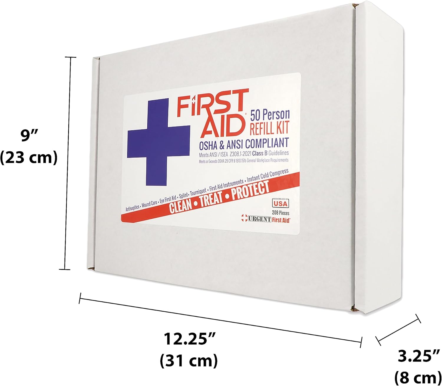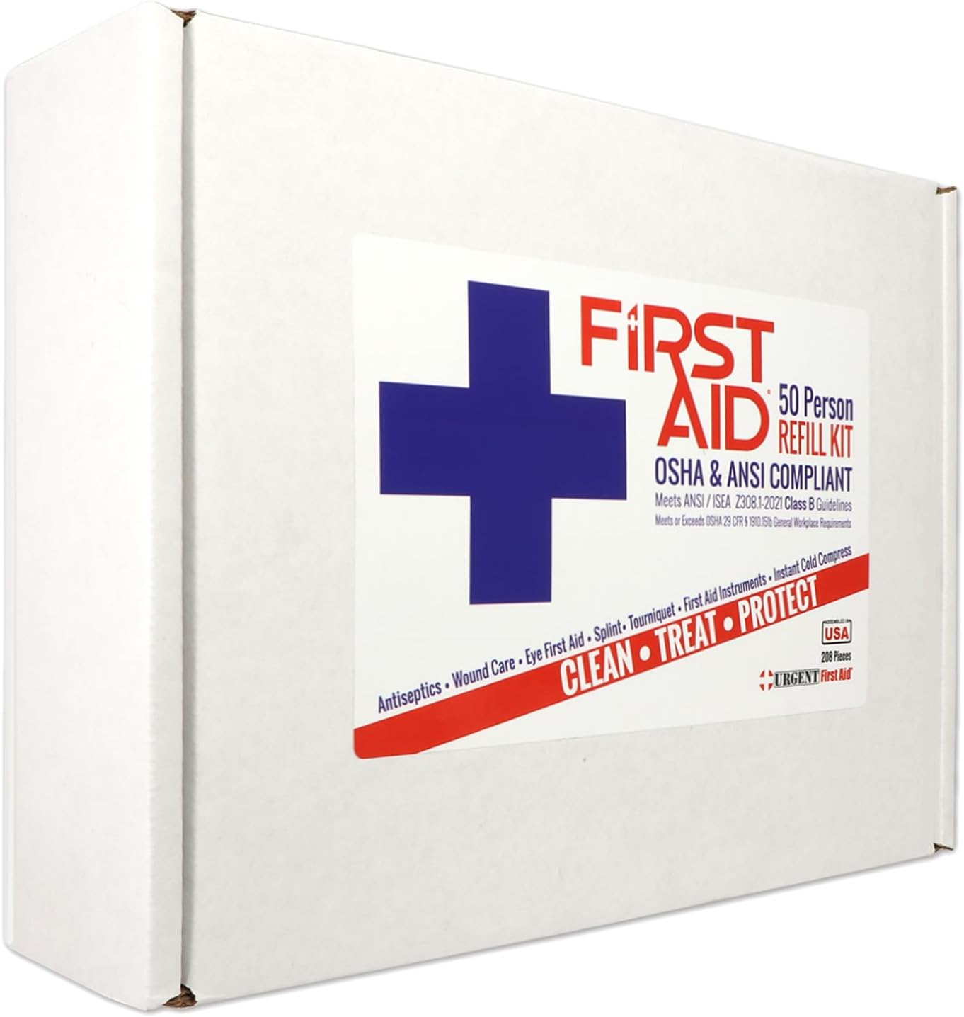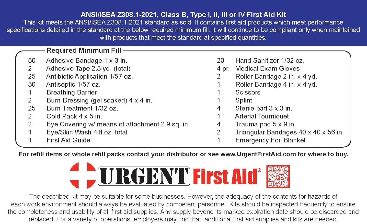 Worried about ANSI and OSHA requirements? This is our most affordable complete ANSI/OSHA first aid kit! Assembled right here in the USA, these Urgent First Aid kits are our best value ANSI Class B first aid kits. These kits meet or exceed the most recent OSHA and ANSI 2021 Standard fill requirements, with contents designed with a broader range and quantity of supplies to deal with injuries in more complex or high-risk environments so you know you and your employees will be covered with the new ANSI 2021 requirements. Under the new ANSI Standard Minimum Requirements for Workplace First Aid Kits and Supplies guidelines, general requirements include the following items: Adhesive bandages, adhesive tape, antibiotic application, antiseptic, a breathing barrier, burn dressing (gel soaked), burn treatment, cold packs, eye covering, eye/skin wash, first aid guide, hand sanitizer, medical exam gloves, roller bandages, scissors, sterile pads, trauma pads, and triangular bandages. In addition the location of the kit must be easily accessible. These ANSI Class B first aid kits are great for small offices and general workplaces of up to 50 people.