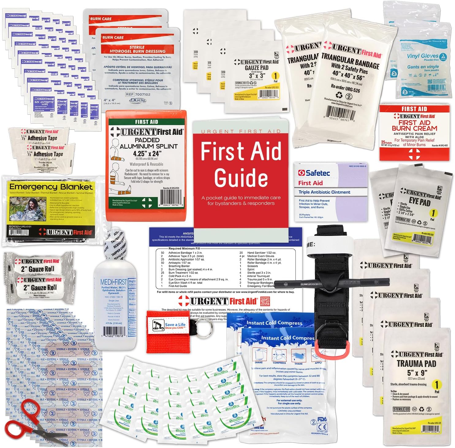 (1) Urgent First Aid 52 page Color First Aid Guide(50) Adhesive Bandage Strips, 1” x 3”(4) Sterile Gauze Pads, 3” x 3”(2) Gauze Roll, 2″(1) Gauze Roll, 4″(4) ABD Sterile Combine Pads, 5” x 9”(2) Eye Pads with Tape Strips(2) Adhesive Tape, 1/2″(2) Triangular Bandage, 40” x 40” x 56”(1) Instant Cold Compress / Ice Pack, 5″ X 6″(4) Vinyl Exam Gloves, Pair(1) Eye Wash, 4 oz (NDC: 47682-198-18)(2) Burn Dressing, 4″ x 4″(50) Antiseptic BZK Wipes (NDC: 67777-245-02)(25) Triple Antibiotic, .5gm (NDC: 69396-125-05)(25) Burn Cream, .9gm (NDC: 69396-124-09)(20) Hand Sanitizer, .9gm (NDC: 61010-1112-2)(1) CPR Mouth Breathing Barrier(1) Bandage Scissors(1) First Aid Arterial Extremity Tourniquet(1) Tourniquet(1) Reusable Splint, 4.25” x 36”(1) Solar Emergency Blanket(1) ANSIA: Class B ANSI Label(1) CASE: Plastic, Metal, or Refill Packs
