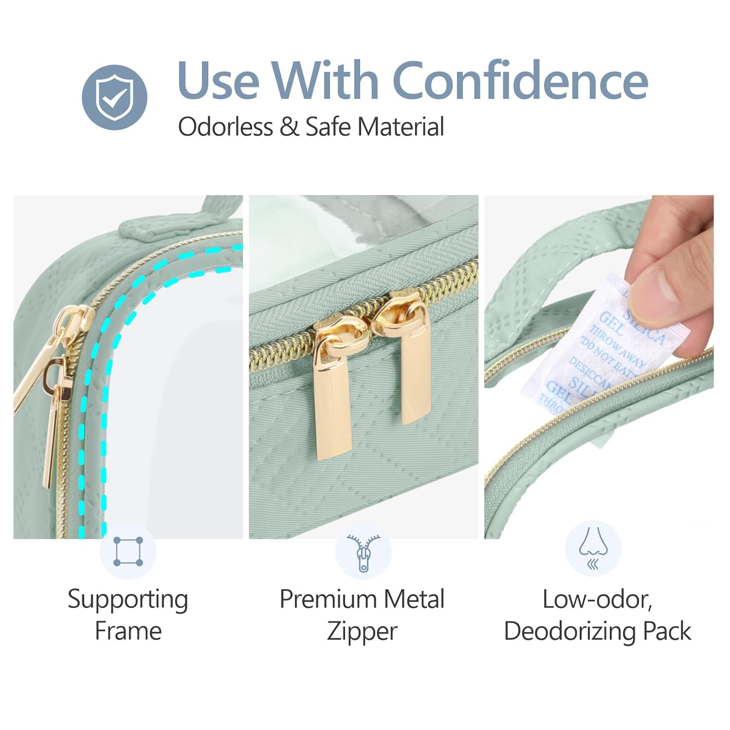 Zip-Around Opening, Easy Access: Double zippers open 180° so the clear bag can be flip-opened horizontally, making toiletries easy to see and grab. A sturdy handle lets you carry or hang it. Smooth metal zippers glide without snagging. Bags arrive folded from shipping—just fill them or gently warm with a hair dryer to restore their shape