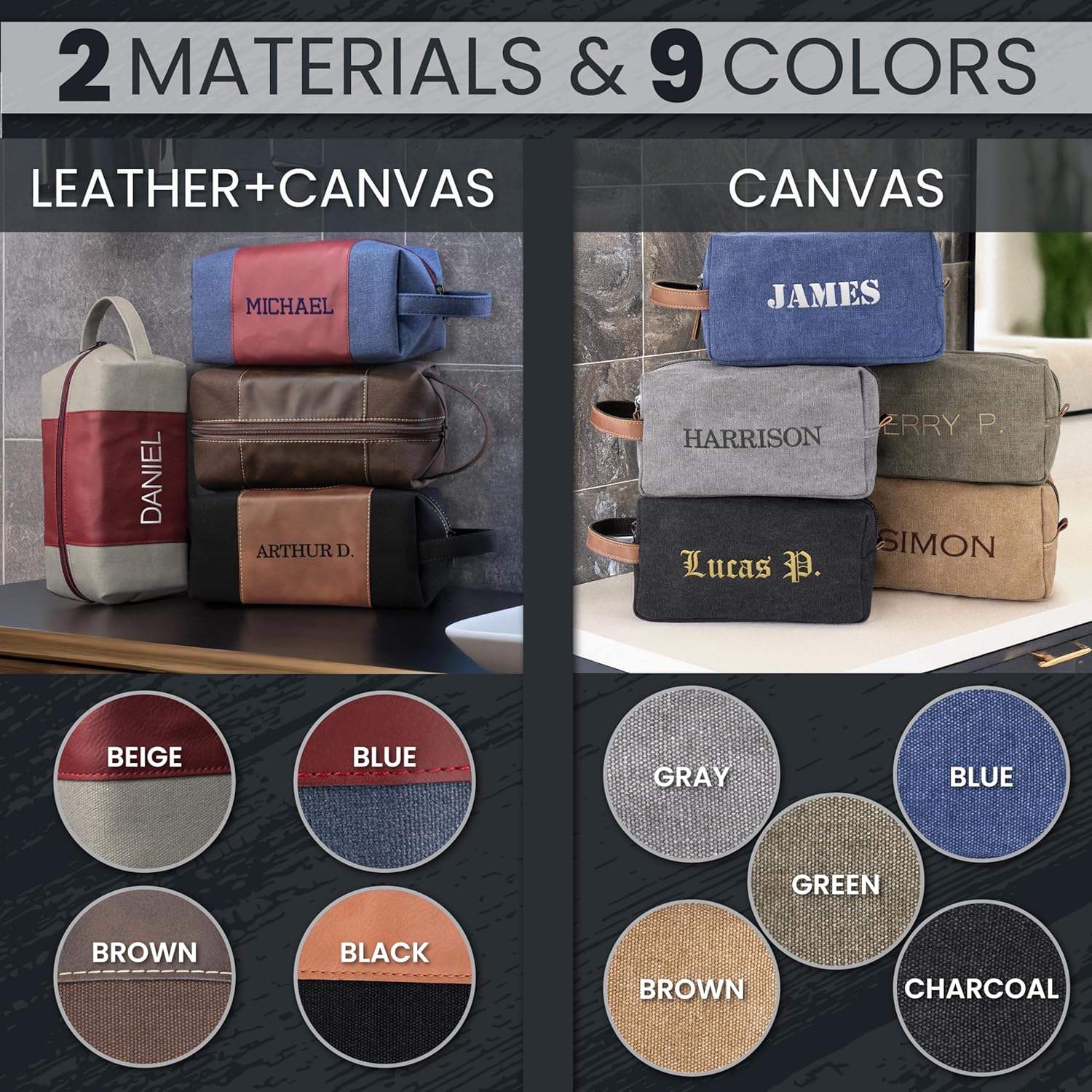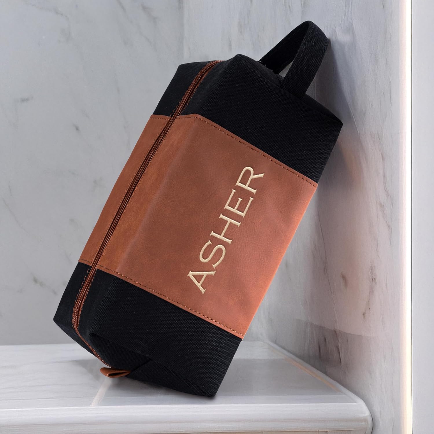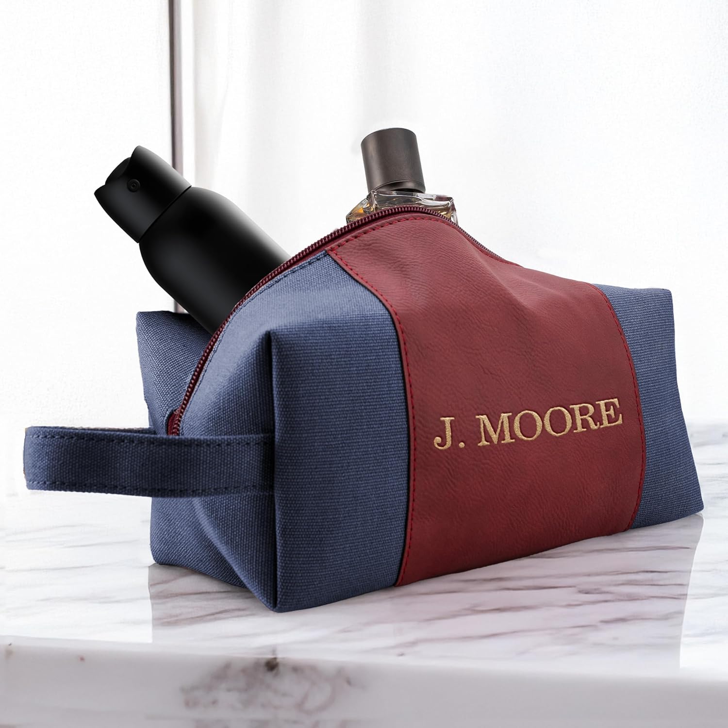 Upgrade his travel routine with our Personalized Embroidered Toiletry Bag, the perfect blend of function and sophistication. Each bag is custom embroidered with your choice of font and thread color, creating a one-of-a-kind accessory. Available in two material styles—durable canvas or a refined leather-canvas mix—this dopp kit is designed to keep grooming essentials organized with its waterproof nylon liner, inner zippered pocket, and easy-carry handle. Measuring 9.5x4x4.75 inches, it’s compact yet spacious enough for all his essentials. Whether it’s a groomsmen gift, Father’s Day surprise, or personalized travel bag, this timeless piece adds a personal touch to any occasion.