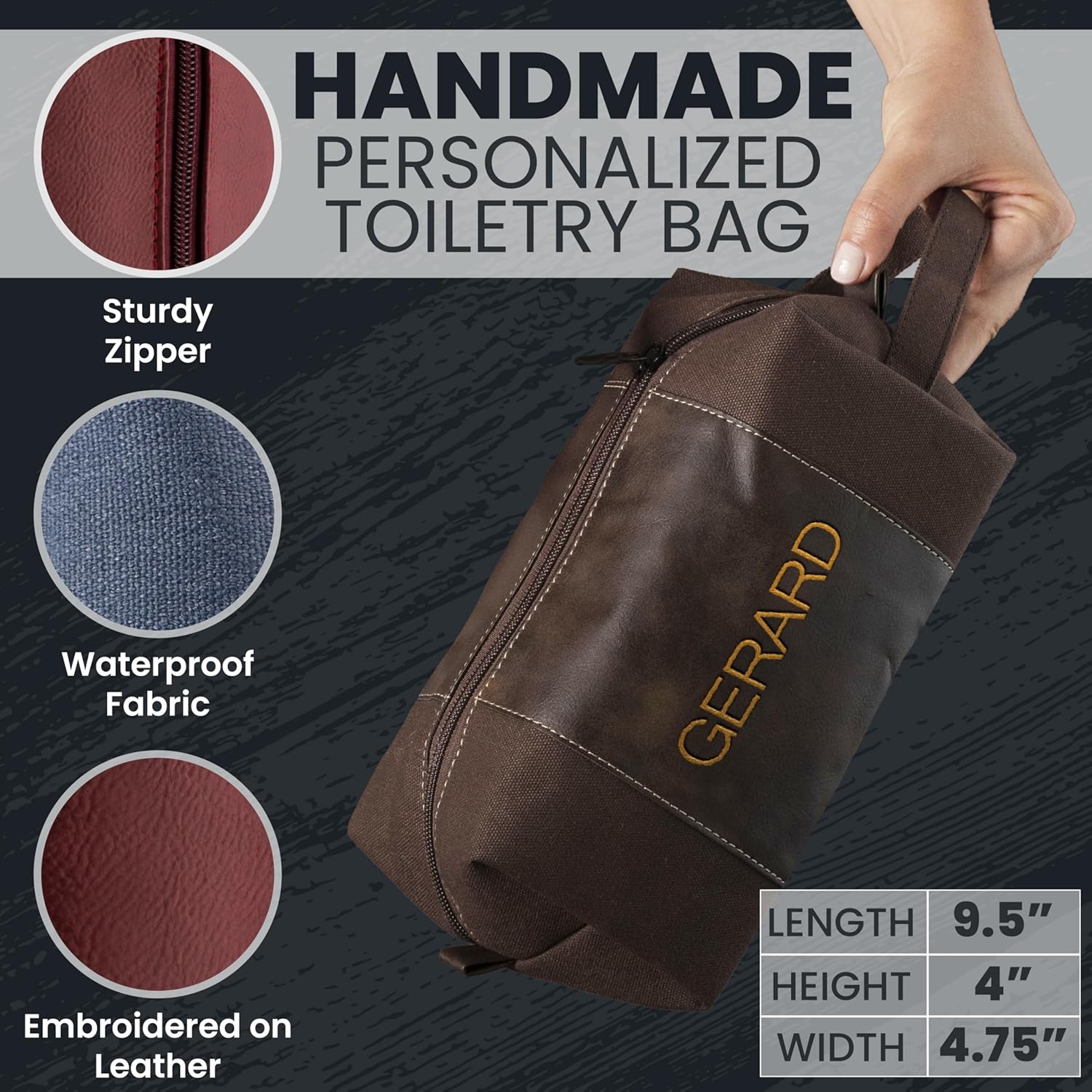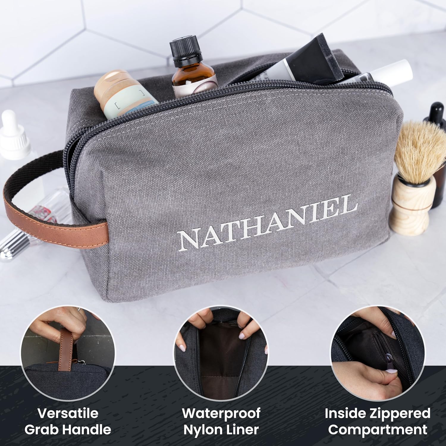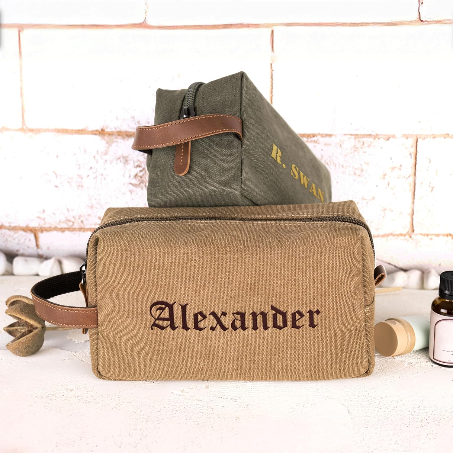 Upgrade his travel routine with our Personalized Embroidered Toiletry Bag, the perfect blend of function and sophistication. Each bag is custom embroidered with your choice of font and thread color, creating a one-of-a-kind accessory. Available in two material styles—durable canvas or a refined leather-canvas mix—this dopp kit is designed to keep grooming essentials organized with its waterproof nylon liner, inner zippered pocket, and easy-carry handle. Measuring 9.5x4x4.75 inches, it’s compact yet spacious enough for all his essentials. Whether it’s a groomsmen gift, Father’s Day surprise, or personalized travel bag, this timeless piece adds a personal touch to any occasion.