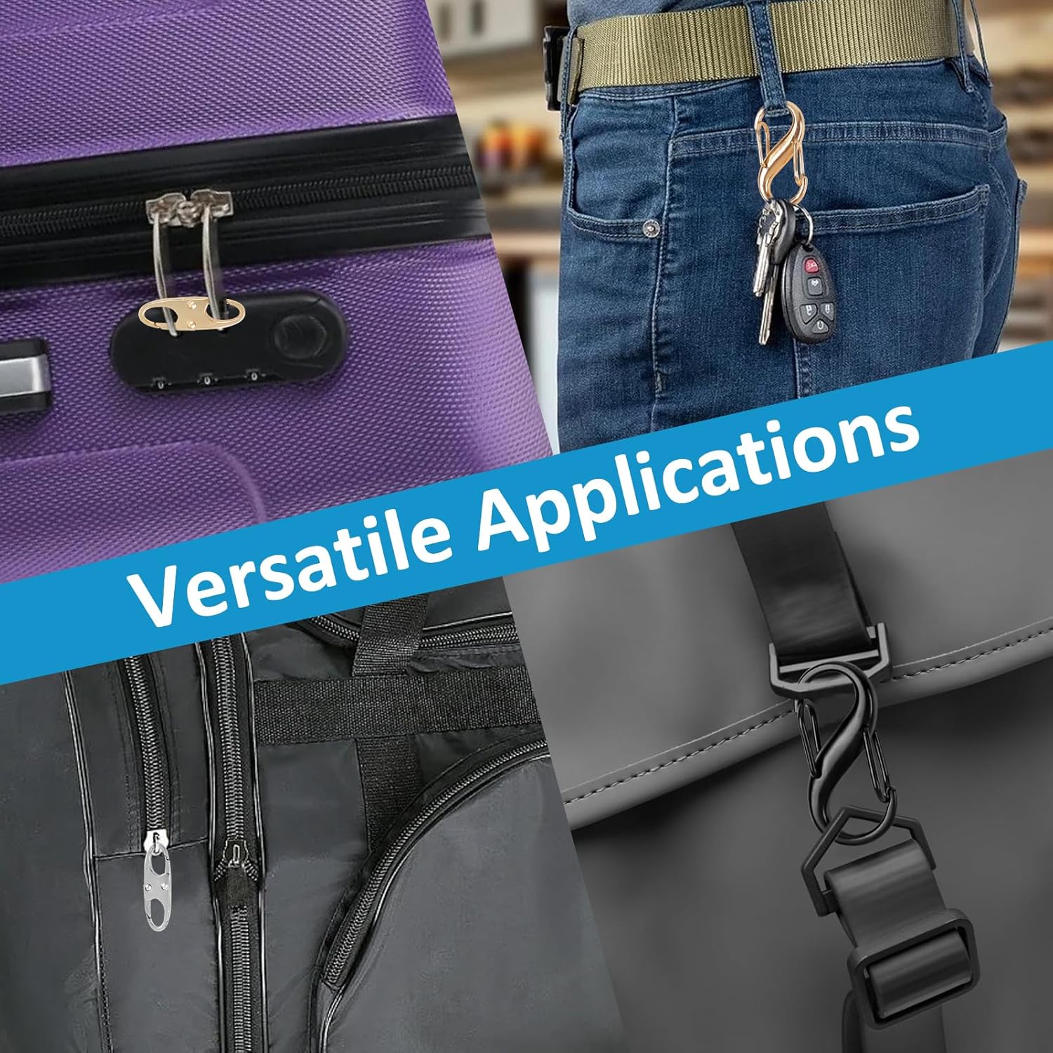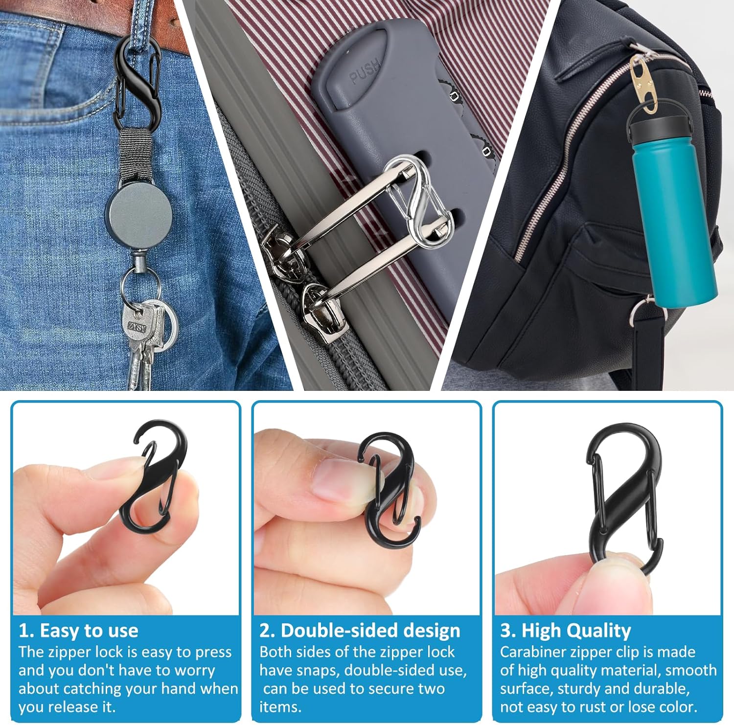 Customers find these zipper locks effective at securing zippers, particularly for purses, and appreciate their added security against pickpockets. The clips are easy to use and clip on, come in various sizes, and are practical for both backpacks and luggage. Customers consider them good value for money and particularly useful for travel, with one customer noting they make bags less accessible in busy airports.
