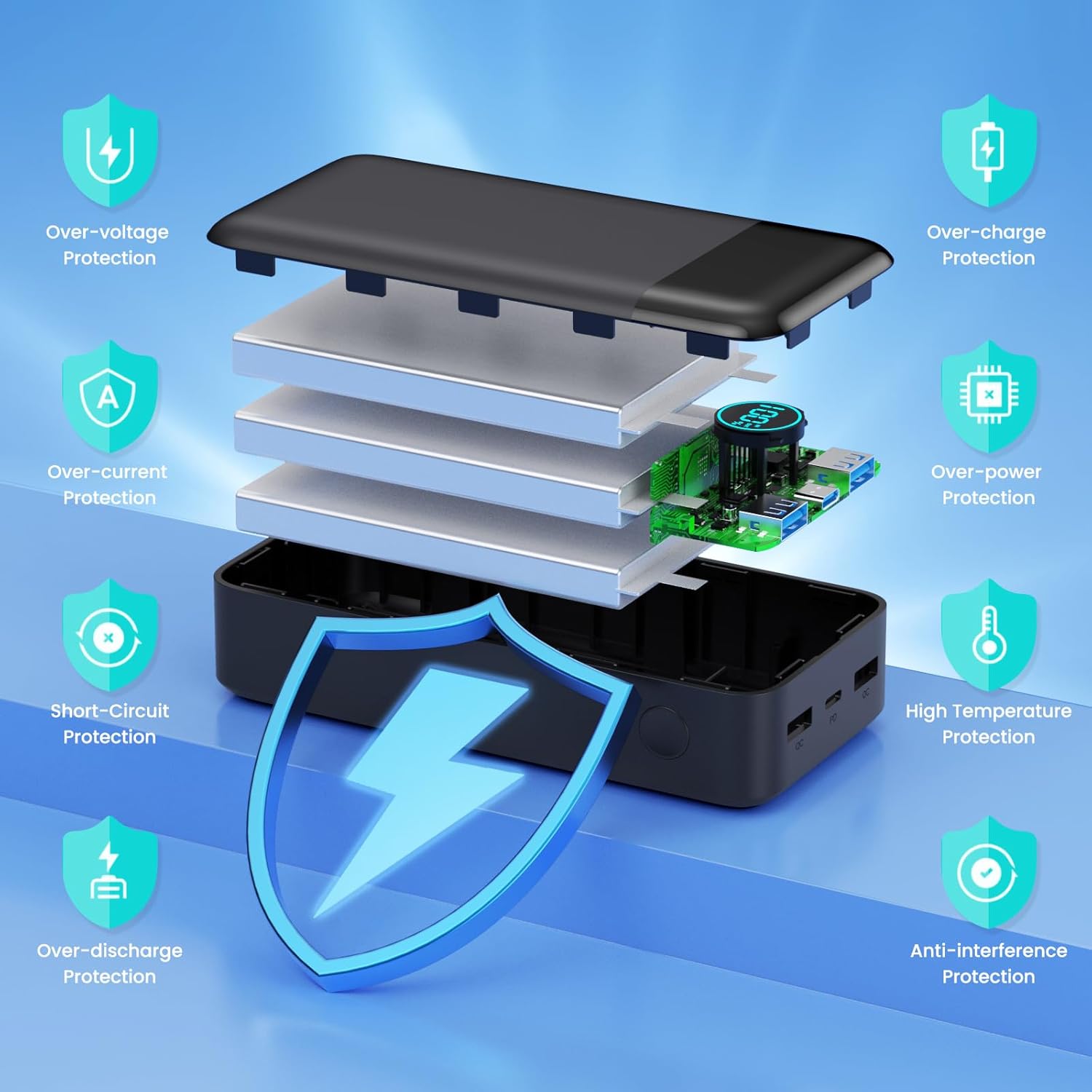 The portable phone charger built in quality batteries and comprehensive multi-protect safety system, include Over-voltage Protection, Over-current Protection,Short-Circuit Protection,Over-discharge Protection, Over-charge Protection,Over-power Protection,High Temperature Protection, Anti-interference Protection,and more. Ensure safety when you using the charging banks.