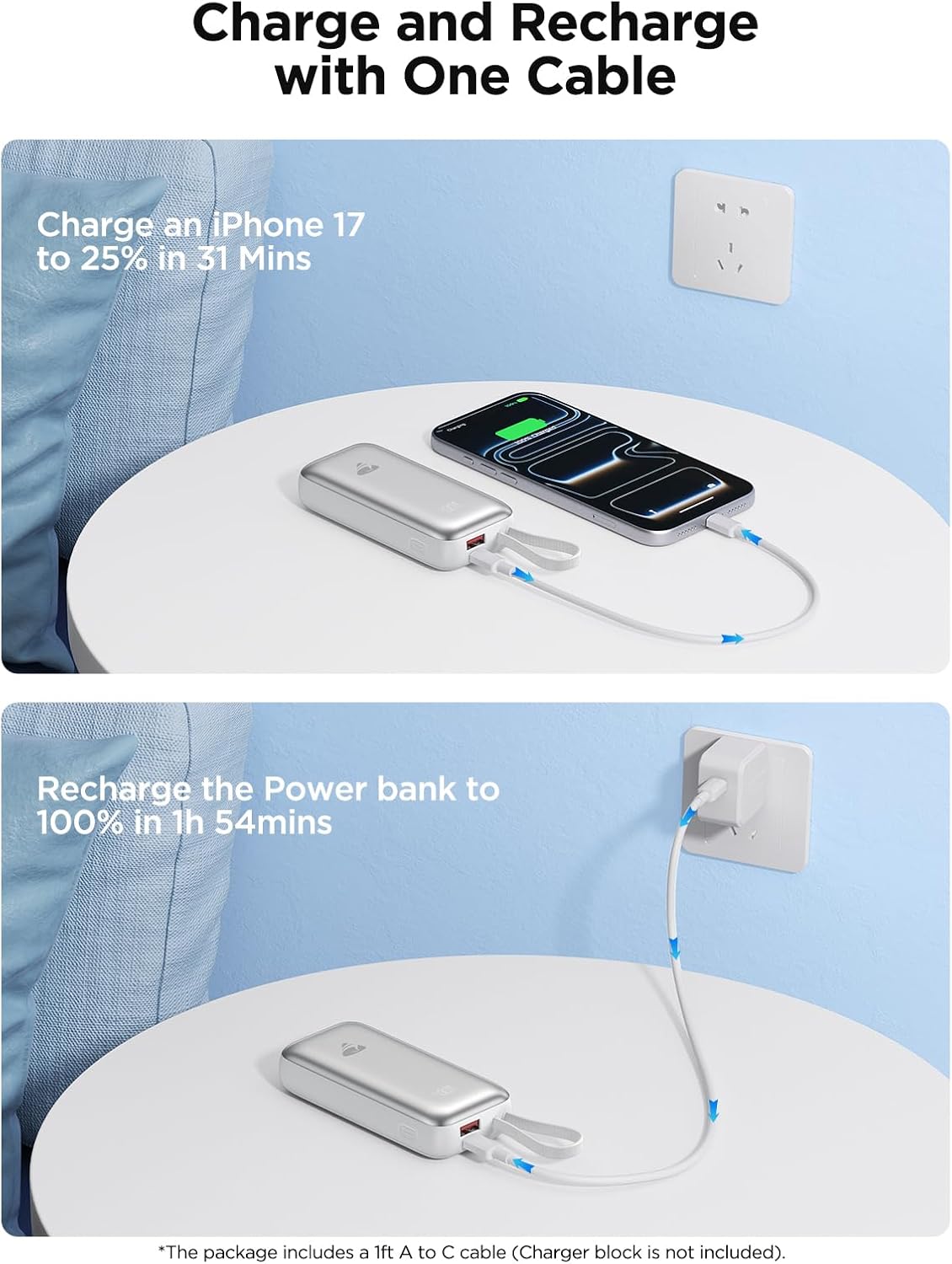 【Portable Charger with 2 Built in Cables】: Aioneus portable charger built with 2 cables, one usb-c cable support fast charging for iPhone 17 16 15, Samsung Galaxy S24 S23, one Lightning cable support charging for iPhone 14/13/12/11/XR/XS/8/7/6. Also, equipped with 1 USB-A(output) and 1 USB-C (input/output) port. Totally 4 ways to charge your device,All in one portable charger, no longer need to carry various cables anymore