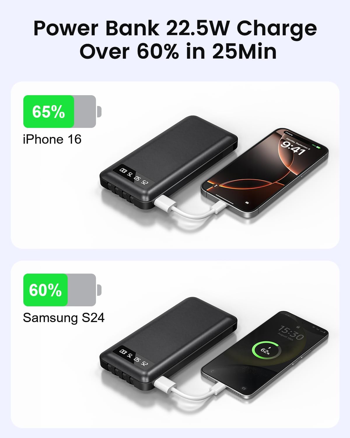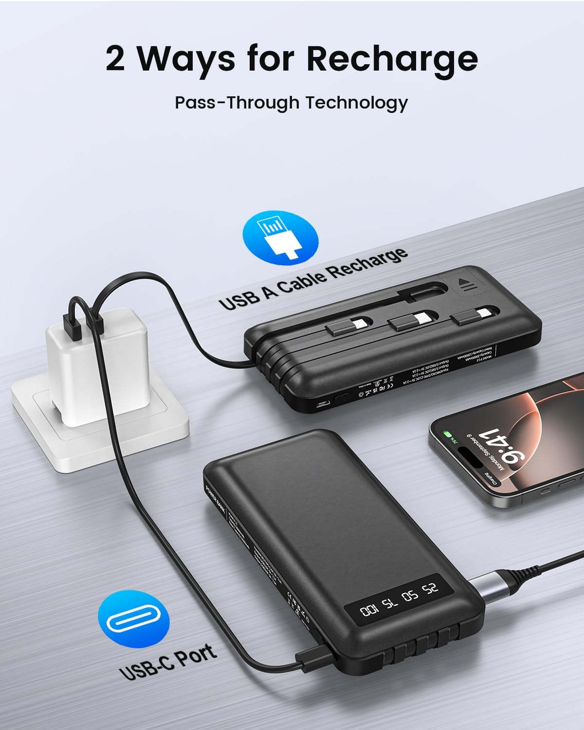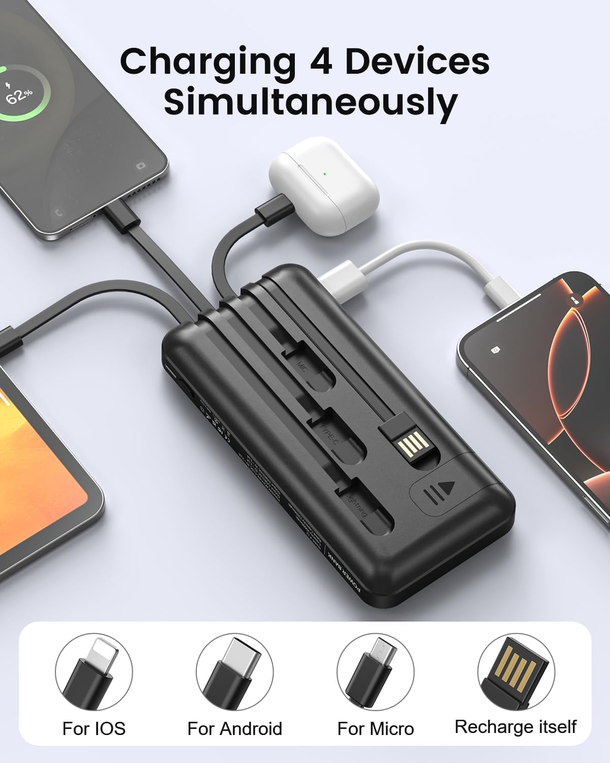 🔋【4 Outputs & 2 Inputs】This rush 3 in 1 portable charger power bank features 4 built-in cables (3 output + 1 input), allowing you to charge up to 4 devices simultaneously without extra cords. Compatible with iPhone, iPad, Samsung, tablets, smartwatches, and more. With dual input options, it’s perfect for daily commutes or travel. Compact and portable, one device covers all your charging needs