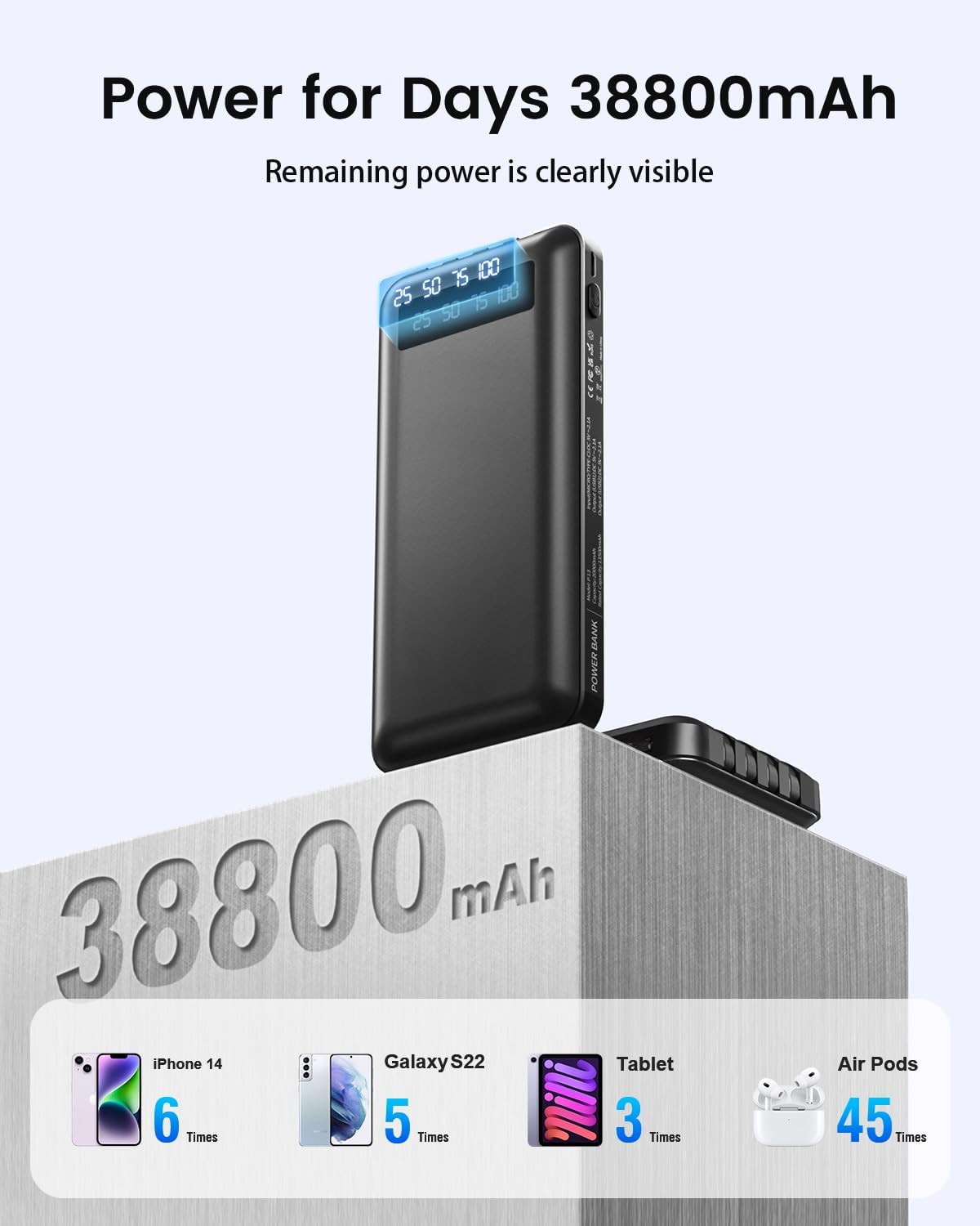 🔋【Huge 38800mAh Capacity – Long-Lasting Power】this high-capacity portable charger delivers days of reliable energy for iPhone 16/15/14/13 series, Samsung, Google Pixel, and more. This cell phone power bank is ideal for long trips, camping, and business travel. Say goodbye to battery anxiety and stay connected anytime, even during power outages or emergencies.