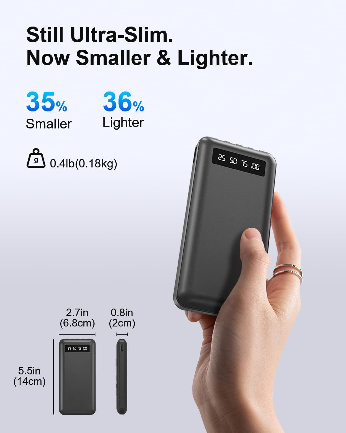 🔋【Super-slim, lightweight, and compact 】Weighing only 0.4lb, this mini and slim power bank fits easily in your pocket or palm, making it ideal for travel, kids, or use as a backup device