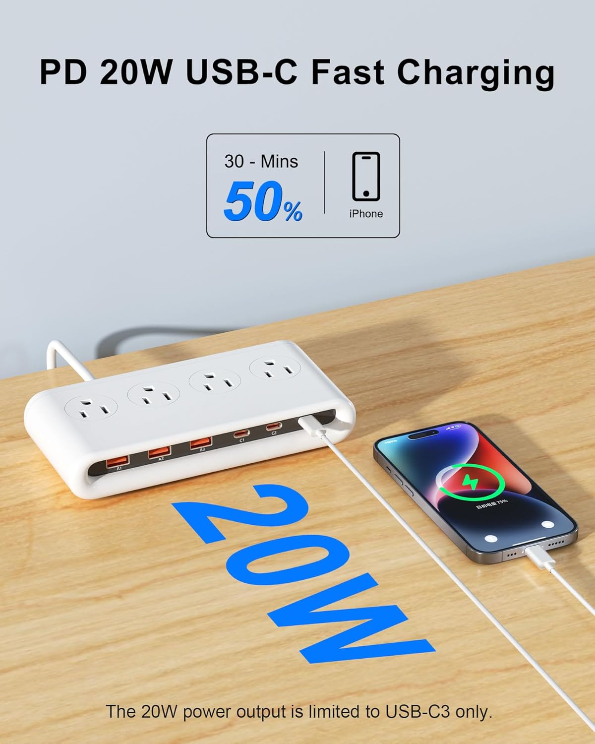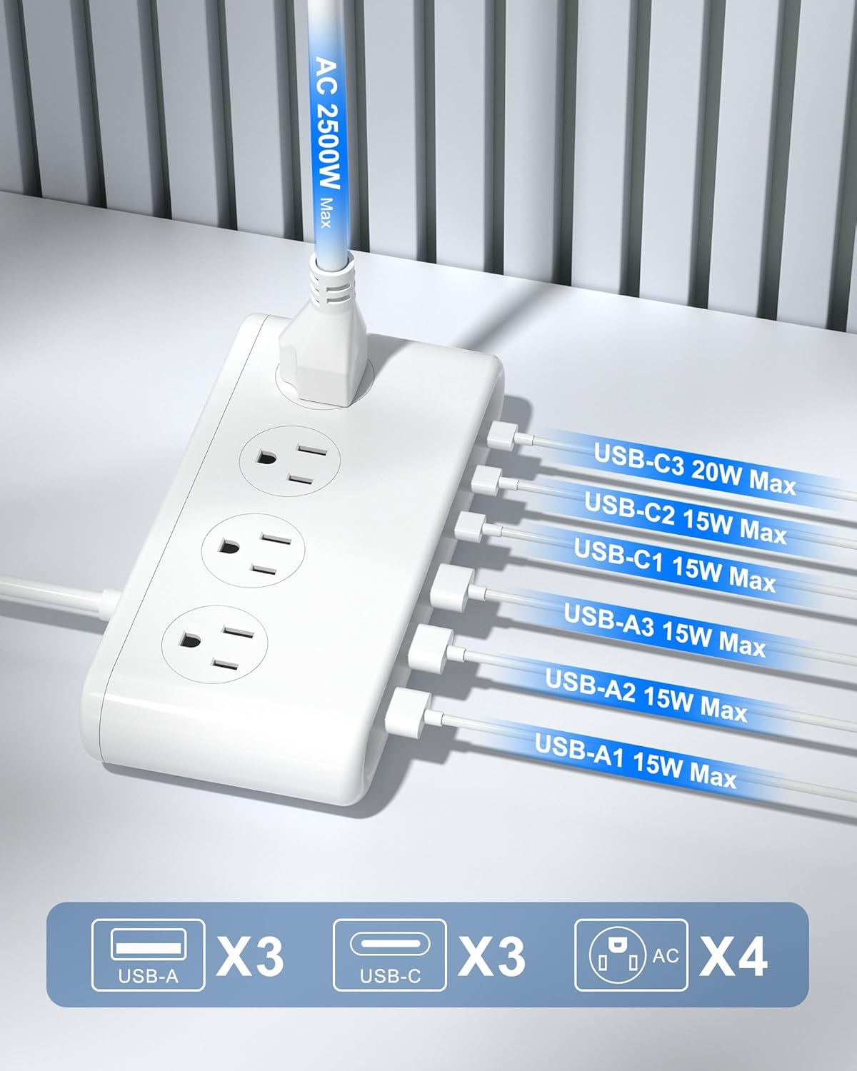 Durable and Safe: With a 2500W rated power output, this USB c charger strip also has grounded protection, over-voltage, over-current, and short-circuit protection built-in, keeping your devices safe and secure