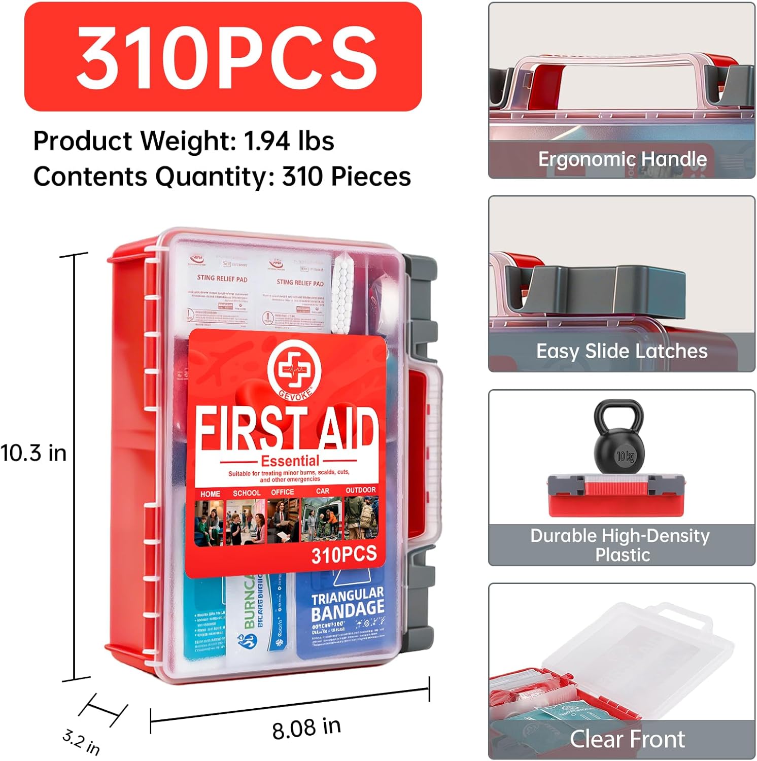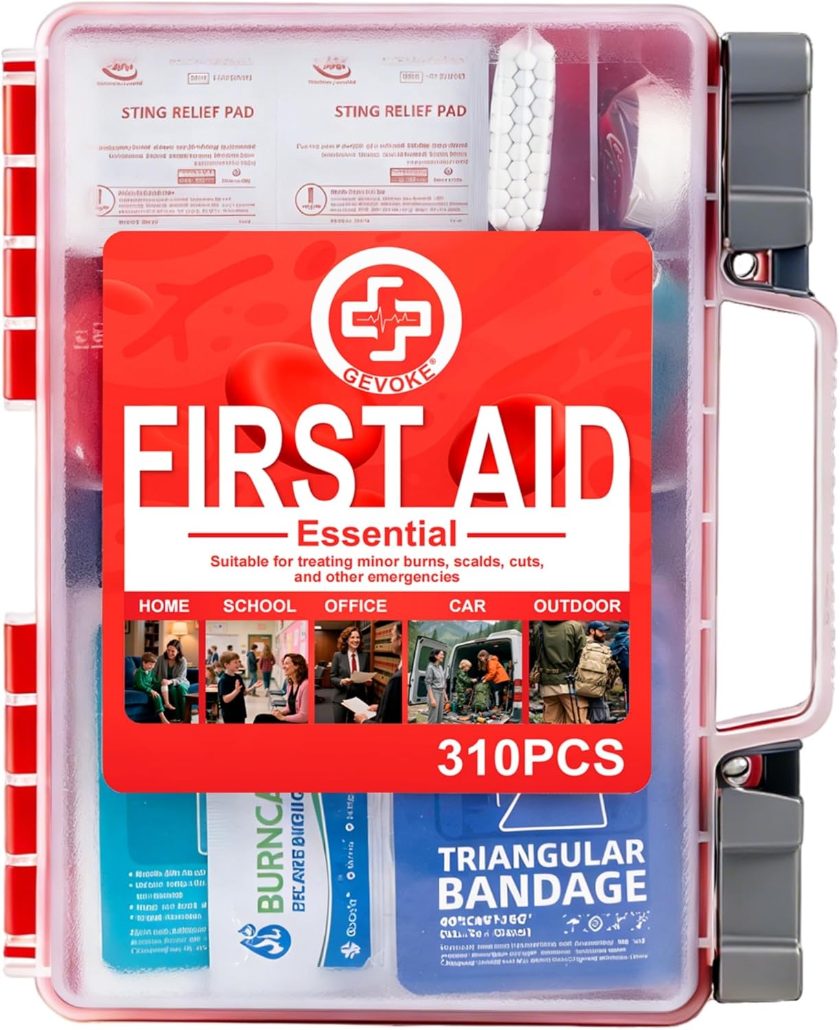 COMPREHENSIVE 310-PIECE FIRST AID KIT: Be prepared for most common emergencies with GEVOKE’s fully stocked kit. Includes adhesive bandages, gauze pads, antiseptic wipes, burn gel, CPR face shield, gloves, triangular bandage, first aid tape, and much more. Everything you need in one essential pack.
