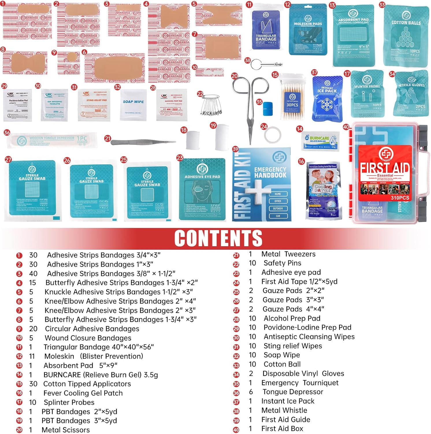 Band-Aids in multiple sizes (standard, joint, fingertip), sterile gauze pads and rolls (for larger wounds), Cleansing Wipes and PVP-Iodine Wipes for cleaning, BURNCARE (Relieve Burn Gel) , Fever Cooling Gel Patch, Disposable Gloves, Emergency Tourniquet, Tongue Depressor ,Instant Ice Pack, Splinter Probes, Metal Scissors, Metal Tweezers,Safety Pins, First Aid Guide,Moleskin, etc.