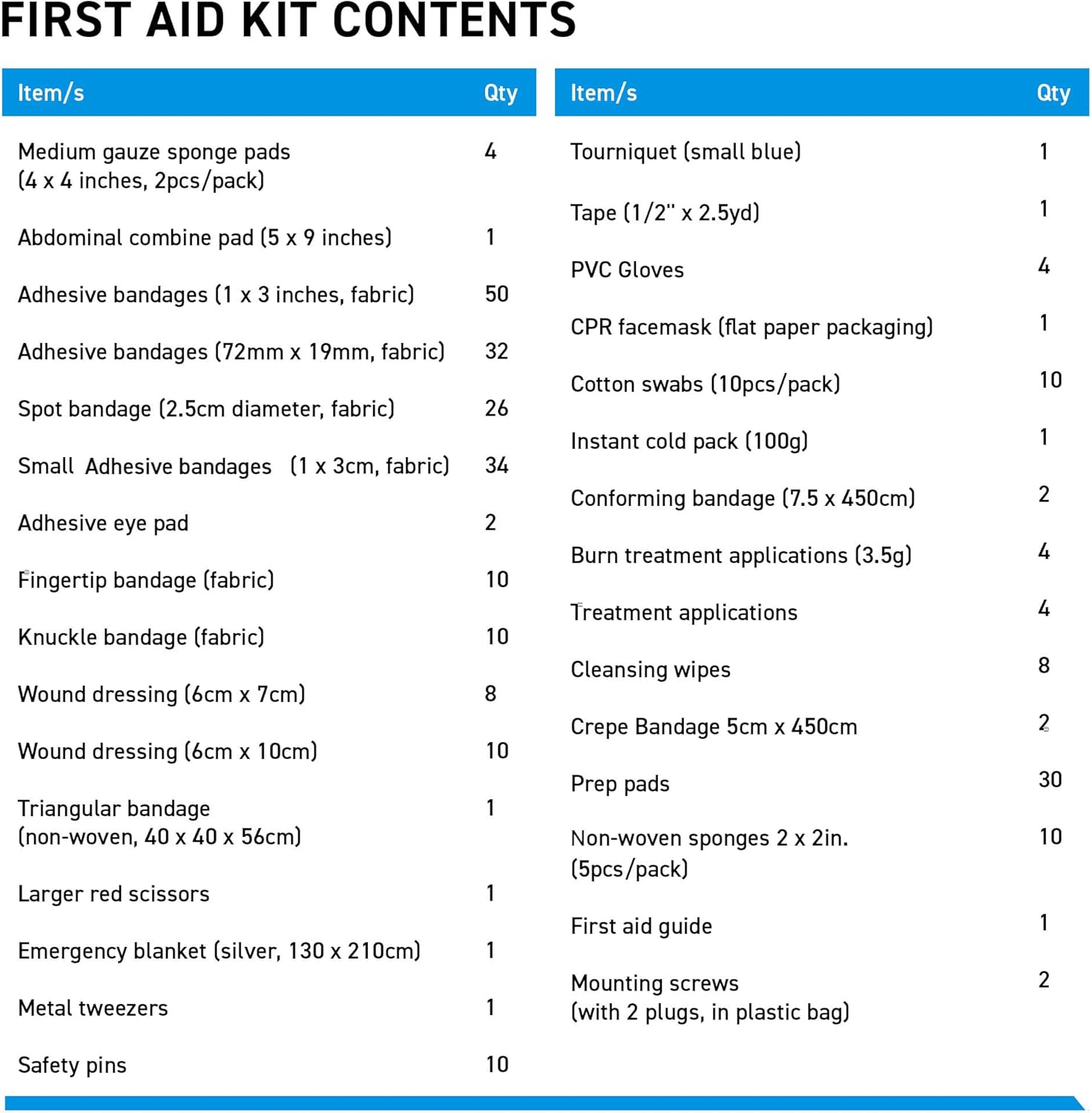 Medium gauze sponge pads (4 x 4 inches, 2pcs/pack) – 4 pieces, Abdominal combine pad (5 x 9 inches) – 1 piece, Adhesive bandages (1 x 3 inches, fabric) – 50 pieces, Adhesive bandages (72mm x 19mm, fabric) – 32 pieces, Spot bandage (2.5cm diameter, fabric) – 26 pieces, Small Adhesive Bandage (1 x 3cm, fabric) – 34 pieces, Adhesive eye pad – 2 pieces, Fingertip bandage (fabric) – 10 pieces, Knuckle bandage (fabric) – 10 pieces, Wound dressing (6cm x 7cm) – 8 pieces, Wound dressing (6cm x 10cm) – 10 pieces, Triangular bandage (non-woven, 40 x 40 x 56cm) – 1 piece, Larger red scissors – 1 piece, Emergency blanket (silver, 130 x 210cm) – 1 piece, Metal tweezers – 1 piece, Safety pins – 10 pieces, Tourniquet (small blue) – 1 piece, Tape (1/2” × 2.5yd) – 1 piece, Disposable gloves – 4 pieces, CPR face shield – 1 piece, Cotton swabs (10pcs/pack) – 10 pieces, Cold pack (100g) – 1 piece, Conforming bandage (7.5 x 450cm) – 2 pieces, Treatment pack (3.5g) – 4 pieces, Treatment applications – 4 pieces, Wipes – 8 pieces, Crepe Bandage 5cm x 450cm – 2 pieces, Prep pad – 30 pieces, Non-woven sponges 2x2in. (5pcs/pack) – 10 pieces, First aid guide – 1 piece, Mounting screws (with 2 plugs, in plastic bag) – 2 pieces