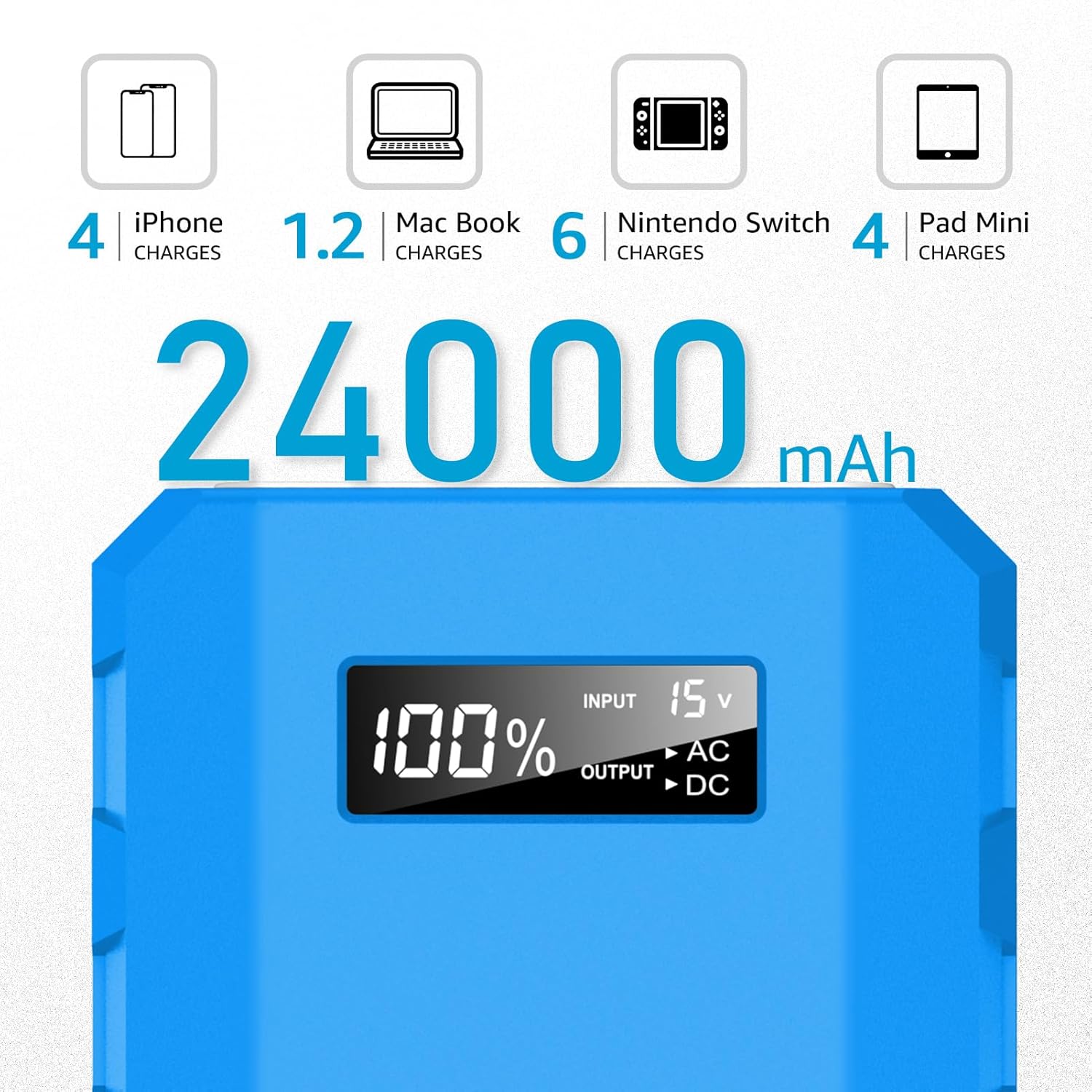 【WHAT YOU GET】: 1× SinKeu 24000mAh AC portable charger, 1× DC15V/2A (30W) input charger, 1× Cigarette lighter, 1× Car charge, 1×User Manual. 30-day go back and 7 x 24 friendly customer service.This portable power bank with AC outlet is also suitable for camping, fishing, traveling and powering festival led lights