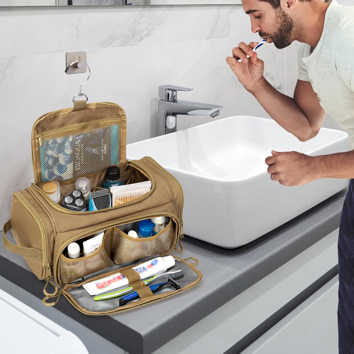 TOILETRY BAG WITH HOOK: The top flap features a mesh pocket for storing personal items and a 360-degree swivel, non-slip hook that easily hangs on towel racks, coat hooks, or tree branches. This design saves space and provides easy access to toiletries while bathing.