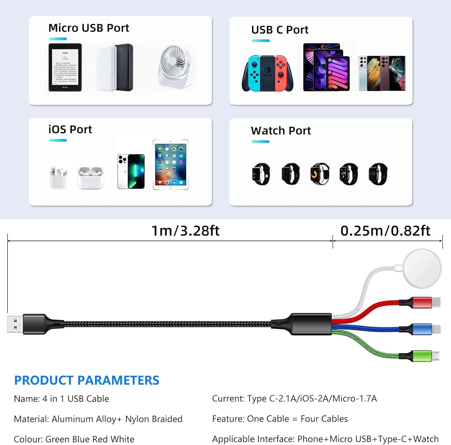 🌎Super 4 in 1 Multi-Function: This multi charging cable is designed to offer four different ports: USB C/Micro/iOSPort/iWatch Charger. There’s no need to prepare and carry multiple charger leads everywhere. What’s remarkable is that it can charge four different devices simultaneously