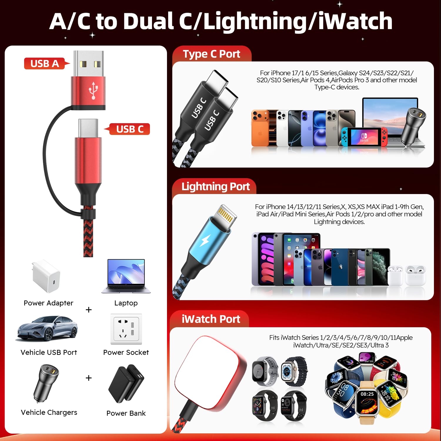 [Travel Essentials & 5FT Length]:Designed for the on-the-go lifestyle, this 2PACK 5FT 4-in-2 universal charger cable accommodates charging both your iPhone Watch and iPhone with one cable. Its space-saving design fits easily into a travel bag/backpack. Ideal for home, office and travel accessories