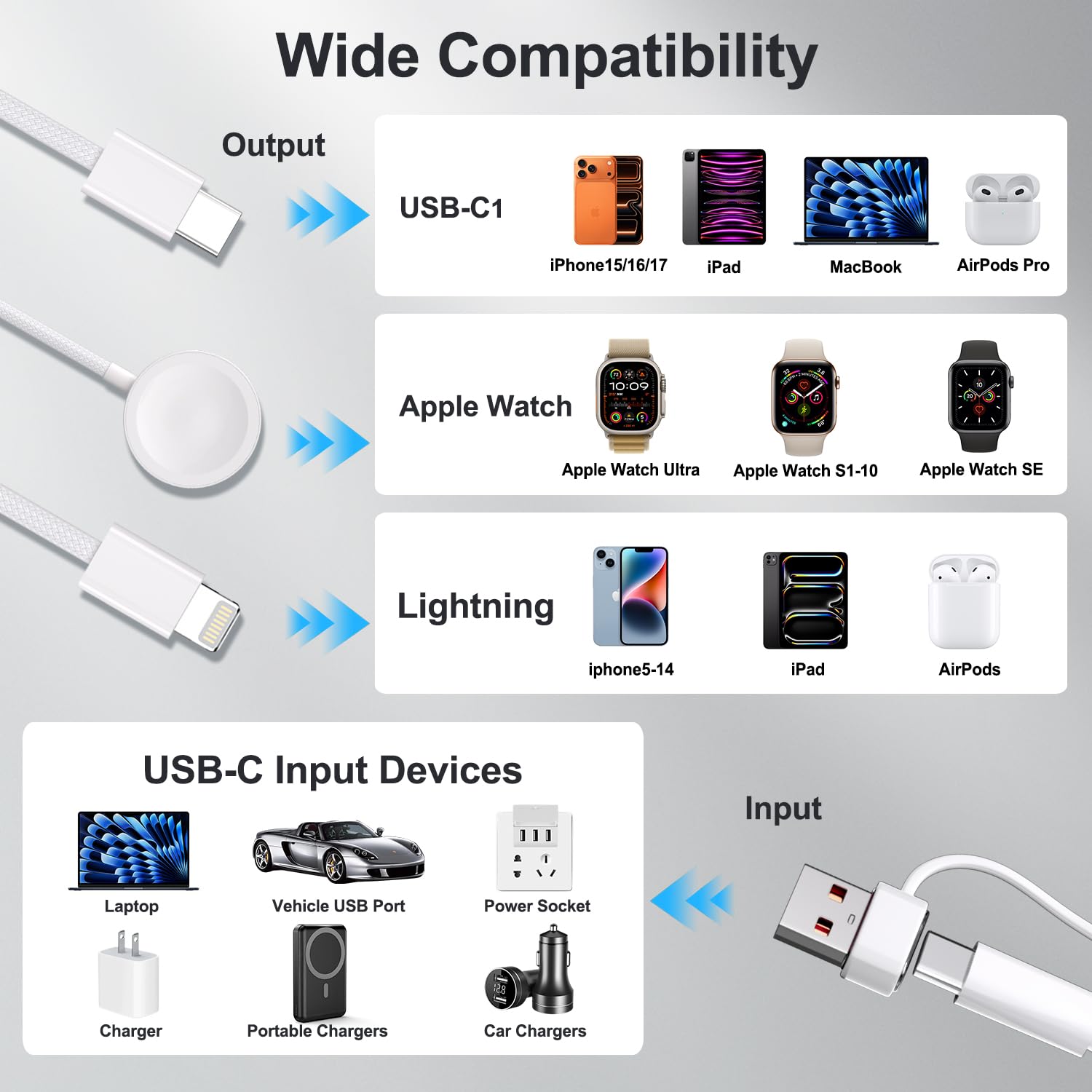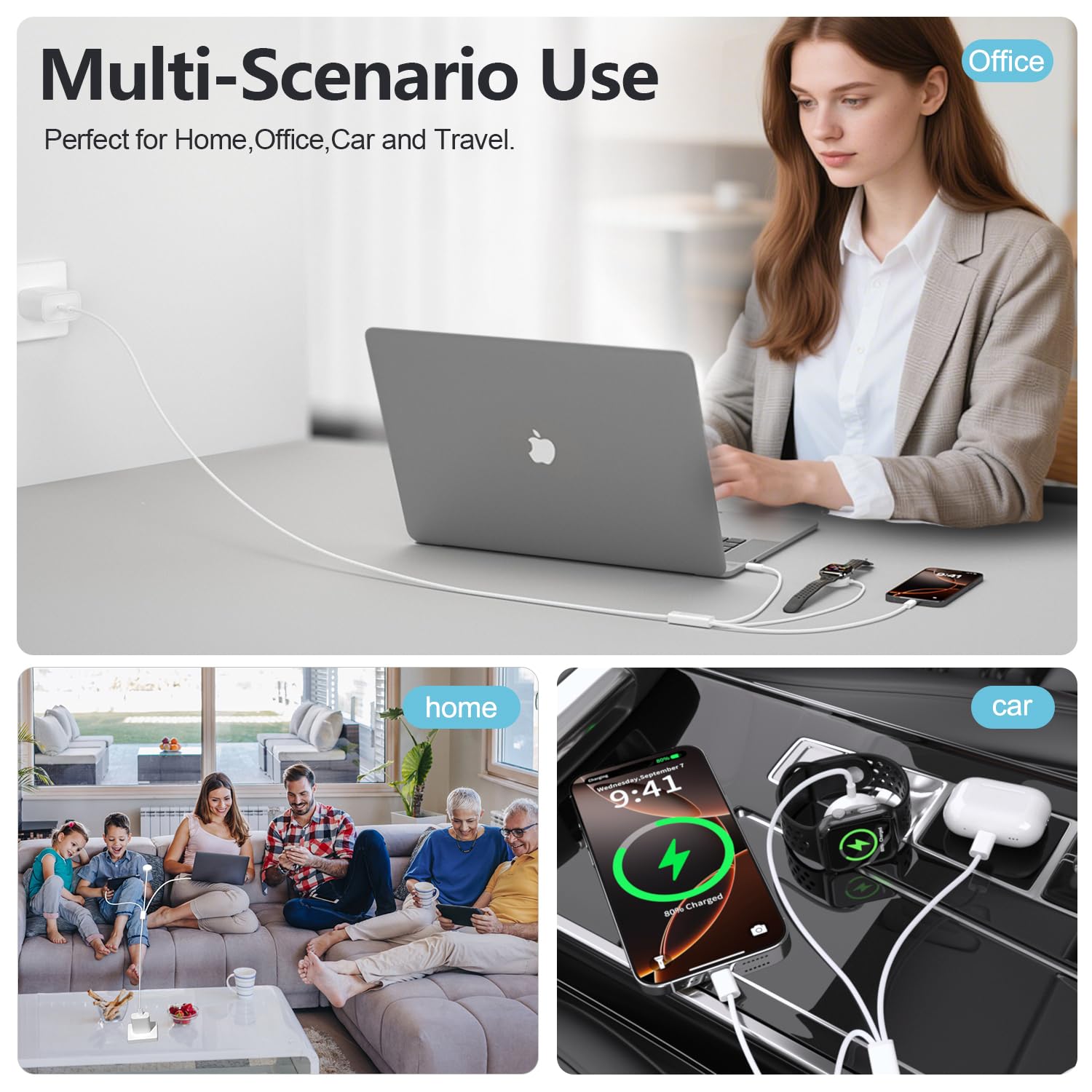 [One Cable for All Your Tech: The Ultimate Travel Companion]: Fully compatible with your entire Apple ecosystem—from iPhone 6-17 and all Apple Watch models to iPad, MacBook, and AirPods—plus other USB-C devices. Its 4.9ft (1.5m) length offers perfect reach anywhere. Ditch a bag full of cables and stay powered on road trips, international flights, cruises, or while working remotely. This is the single cable solution for any adventure
