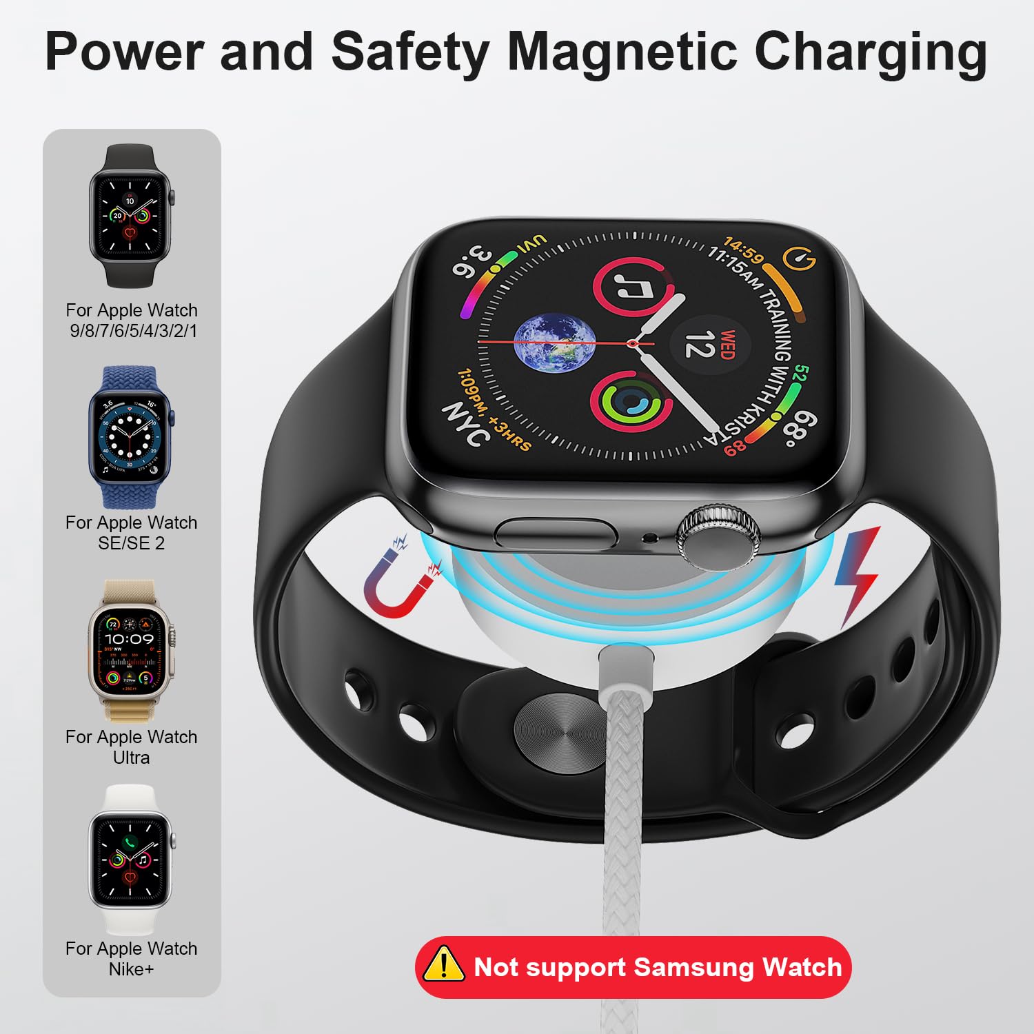 [Smart Magnetic Lock & Perfect Fit for Apple Watch]: Engineered with a precision built magnetic charger, it snaps onto your Apple Watch Ultra, SE, or any Series model instantly and securely. The strong magnetic alignment ensures perfect contact every time—no fumbling, no adjustments. Enjoy effortless, worry-free charging whether you’re at home, at work, or on the move.(Designed exclusively for Apple Watch.)