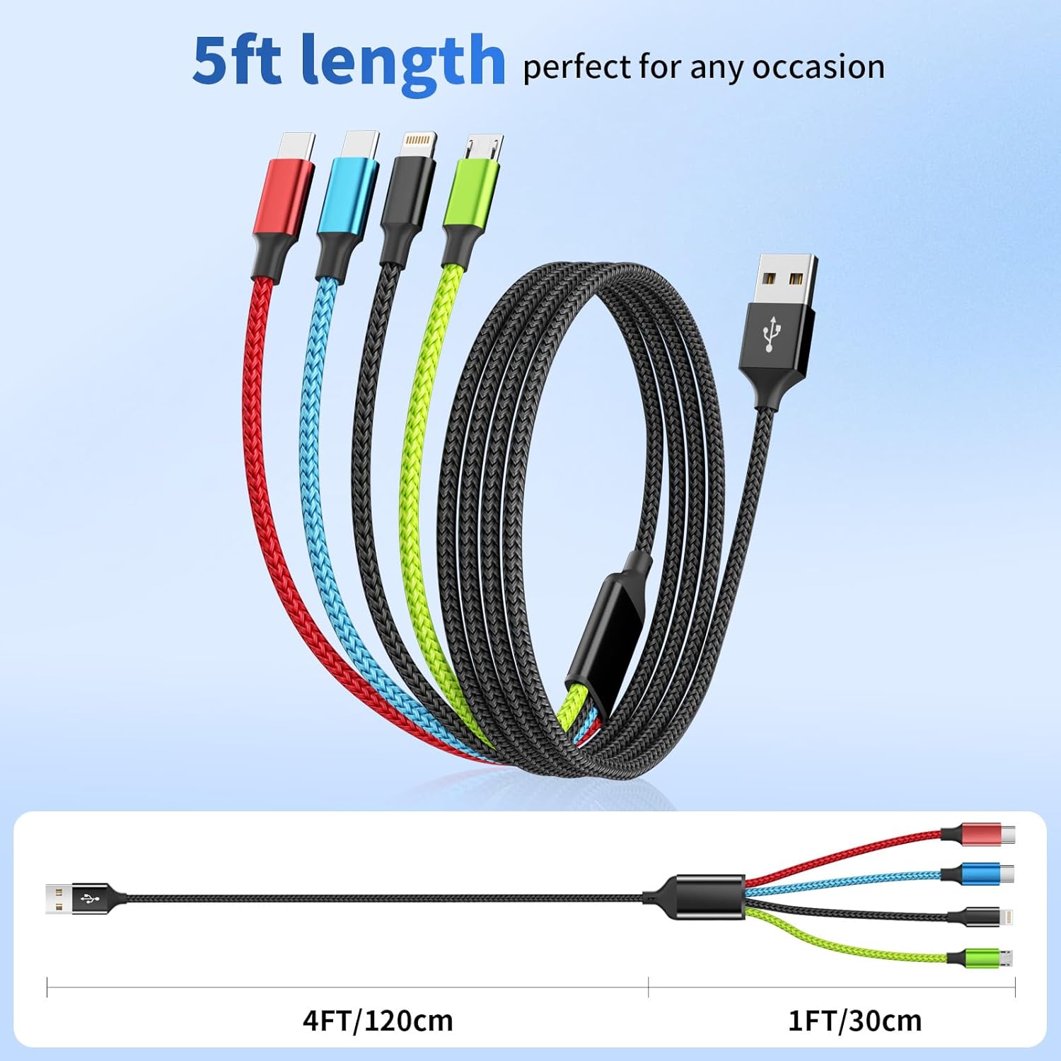 【Universal Travel Essentials Cable – 5FT for Every Scenario】This 4-in-1 multi charging cable is your all-in-one charging companion for every situation. Whether you’re traveling internationally, commuting locally, or just relaxing at home, this charging cords fits right in. Ideal for road trips, camping, airplane rides, hotel stays, beach days, and even cruise vacations. It’s perfect for college dorms, office desks, airport lounges, coffee shops, and ride-sharing. Heading to a national park, backpacking across Europe, attending a tech conference, or just powering up on your daily commute—this compact and portable cable keeps all your devices charged, wherever life takes you.