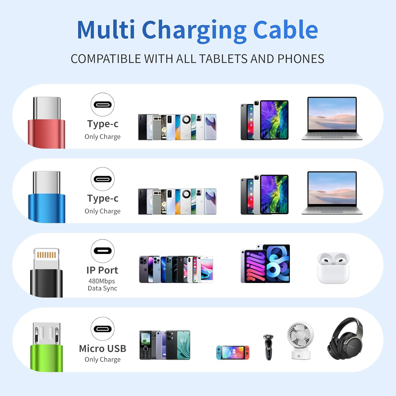【4 in 1 Multi Charging Cable】Firsting usb cable with different ports using our universal 4 in 1 charging cords. It supports iPhone, USB-C, Micro USB, and more, eliminating the need for multiple phone charger. (Dual Type-C Port. Only iOS Connector Support Data Sync, 480Mbps)