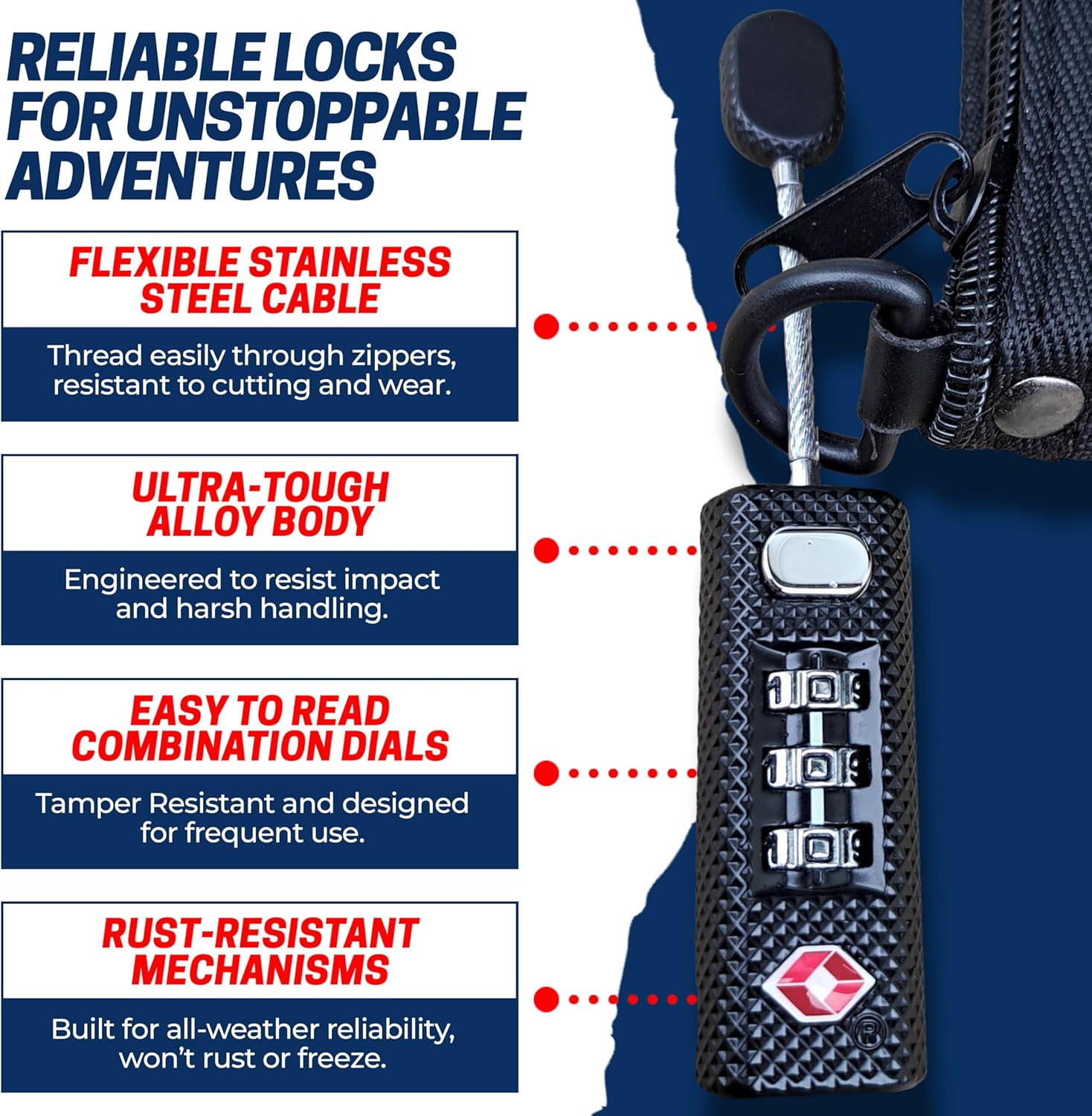 DURABLE ZIPPER LOCK IN THE MARKET: Our TSA approved locks for luggage are made up of an ultra-tough alloy body to protect your locks; this approved TSA lock has hardened stainless steel internal locking mechanisms that won’t rust or freeze, and is suitable for all weather and all terrains
