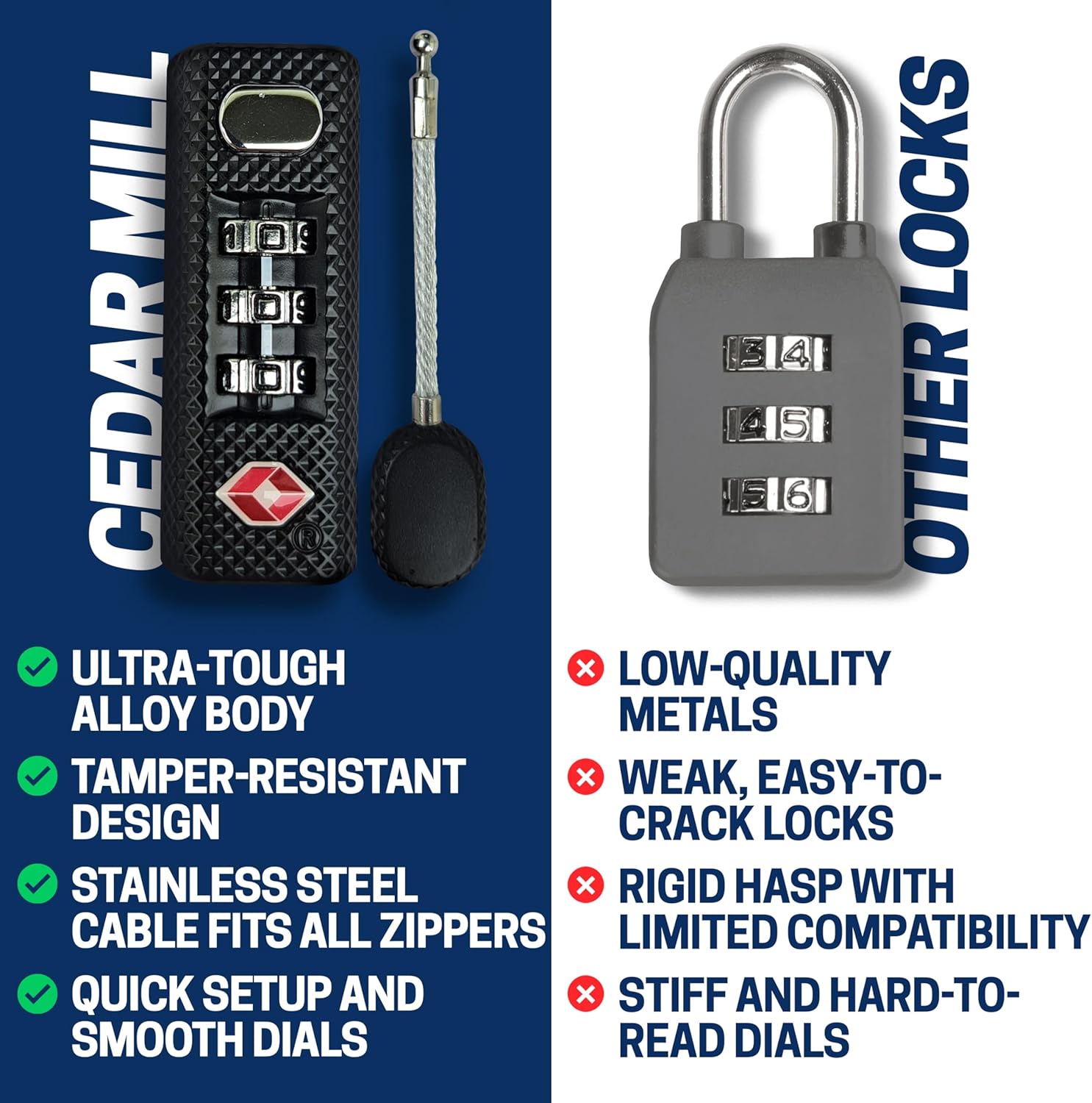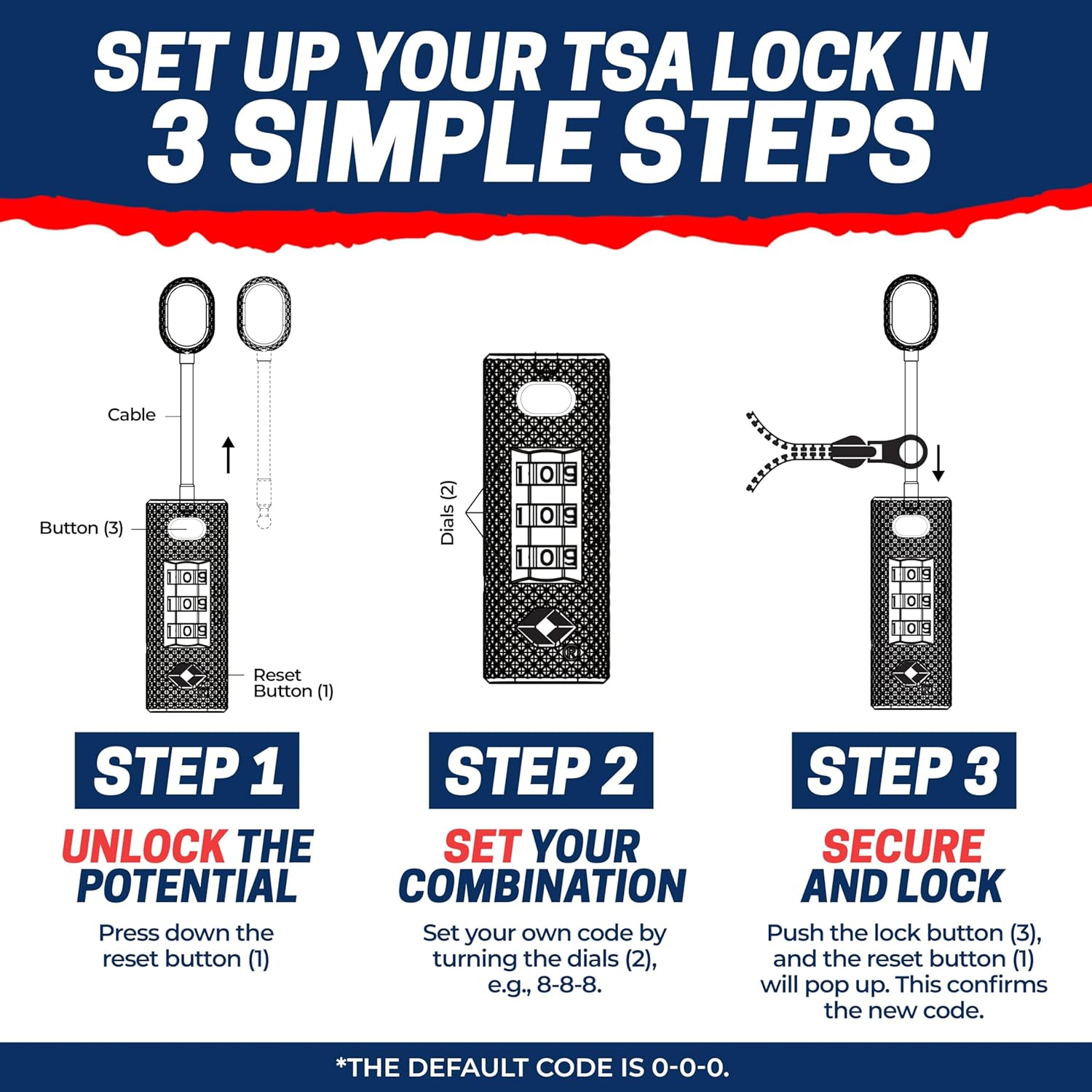 THE SECURITY OF THREE DIGITS: These TSA approved luggage locks offer maximum protection with a 3-digit combination that’s easy to set and remember; a TSA luggage lock that’s tough for thieves to crack and great for military use, travel, firearms, and essential gear